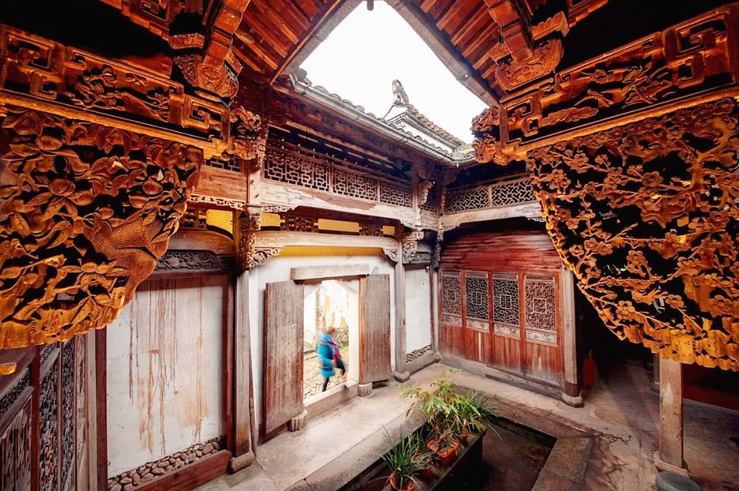 一进村中乌井村,就能看见一幢江南特色的白墙黛瓦的院落,蔚蓝的天空下,马头墙错落有致,气势轩昂,整座大院建筑雕梁画栋工艺十分精湛,这就是堪称木古典雕艺术殿堂的黄家大院。