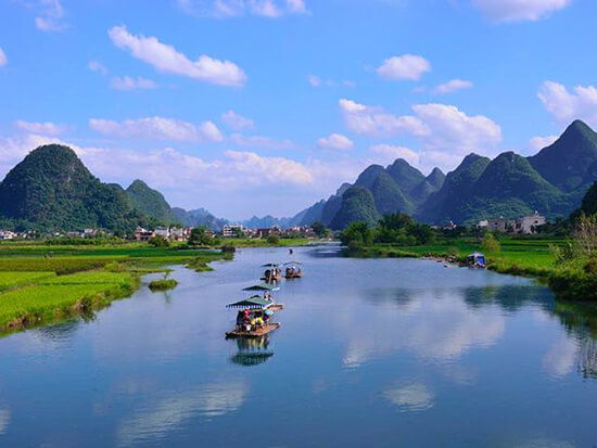 结束市区观览后,我们来到了阳朔。这里没有了大城市的喧嚣,有的是天随人愿的和谐与美丽。我们观赏了艺术家们以其丰富想设计的,如梦似幻夜景和如水山歌中的《印象刘三姐》晚会,感受了经艺术提炼的劳动人民生活的壮美。我们还在一家如簇翠峰中的山庄屋顶,不受干扰地欣赏了薄暮冥冥中如幻似梦的落日与晚霞,以及晨雾朦朦下充满希望的旭日与朝霞,并深深地陶醉于其中。更令人难忘的是在遇龙河约40分钟的竹筏漂流。