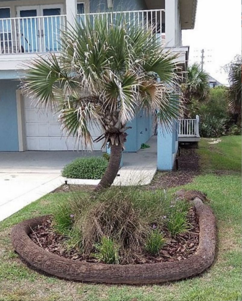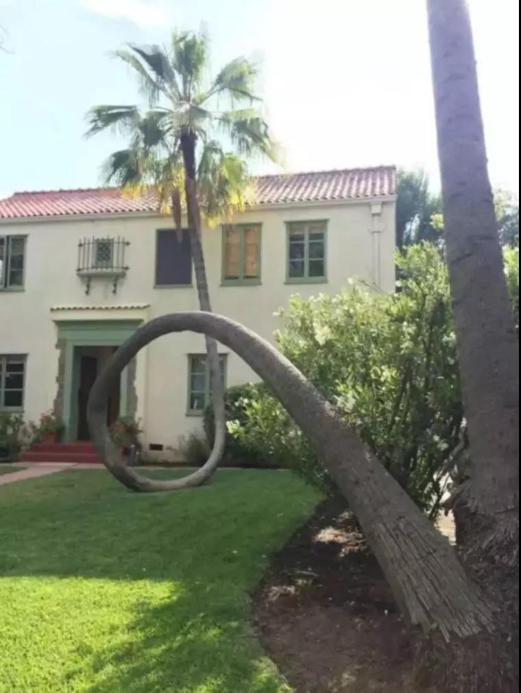 这颗棕榈树的枝干在地上绕了个弯,又继续顽强向上生长。