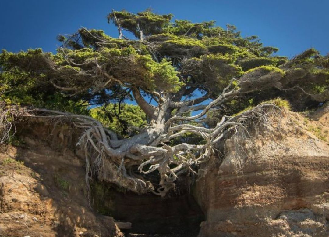 这棵树几乎悬空生长,大部分树根都暴露在外面,只有少数几根依附在坚硬的悬崖岩石上,顽强的维持生命。