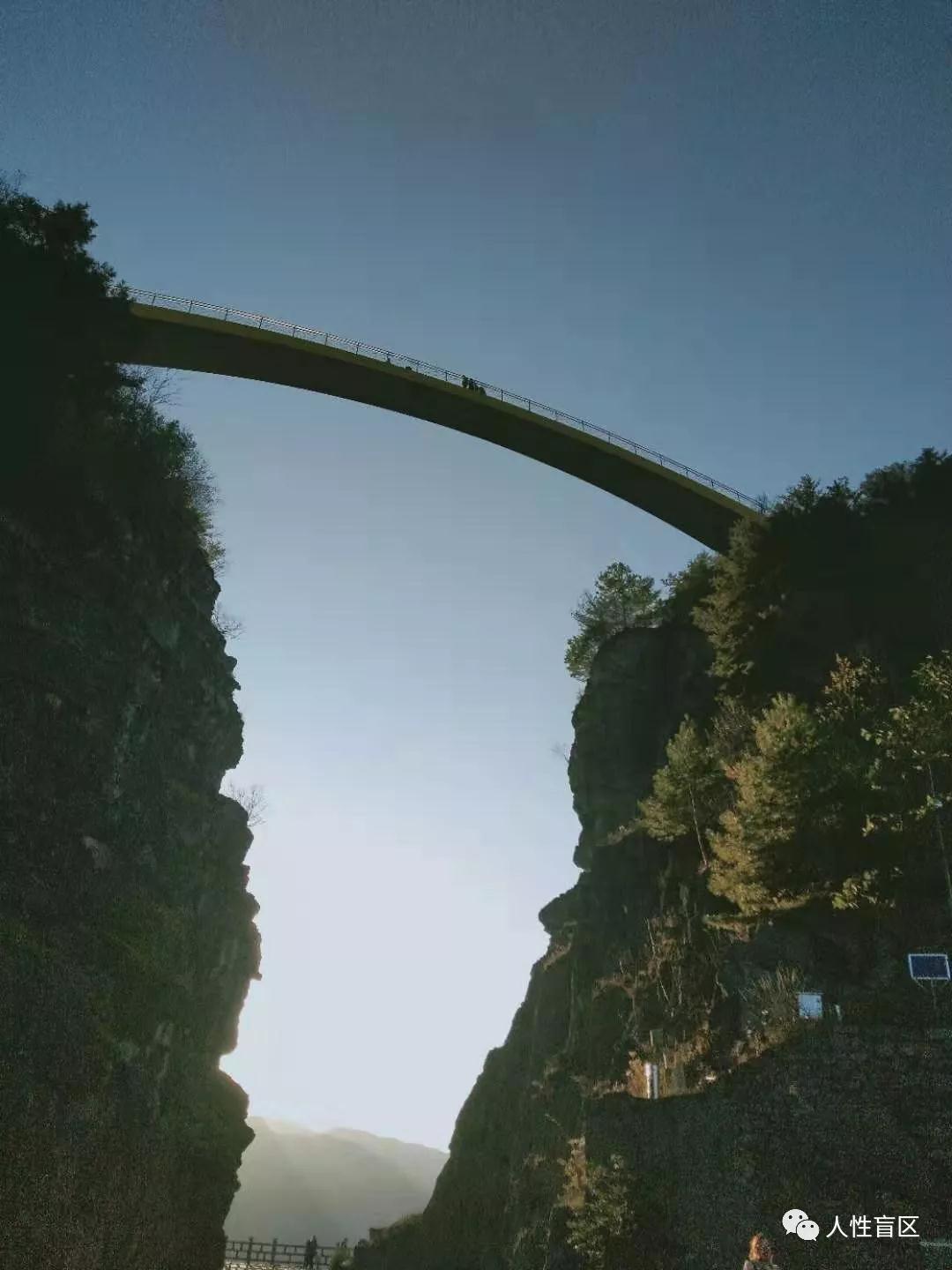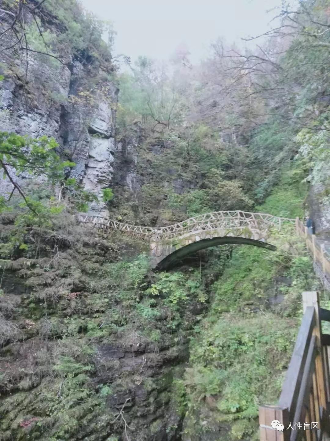 转过几座山头后,眼前突现于二座峭壁下,横跨着一座古石桥。桥面上的栏杆是新做的,远观甚是幽静柔美,跨度虽不大,但其下面的悬崖深度却不可小觑,达一千多米。