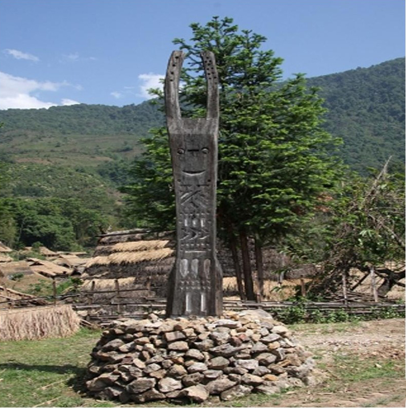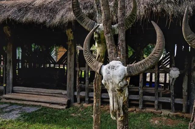 佤族在古语当中的意思为“住在山上的人”,茅草房,图腾柱,牛头,全是佤族人的象征。佤族是以牛为祈福崇拜的民族,牛在他们心目中是吉祥、神圣、高贵、庄严的象征。