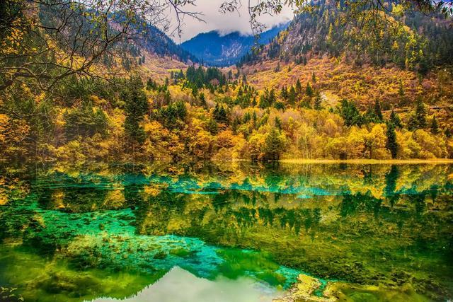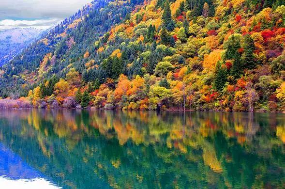 2万多公顷莽莽苍苍的原始森林一齐层林尽染,种类繁多的植物或红或黄,形成一片片五彩缤纷的彩林,倒映在瓦蓝的湖面,再与湖底五颜六色的钙华和藻类相互交映,让人仿佛误入迷幻之地,久久不能自拔……