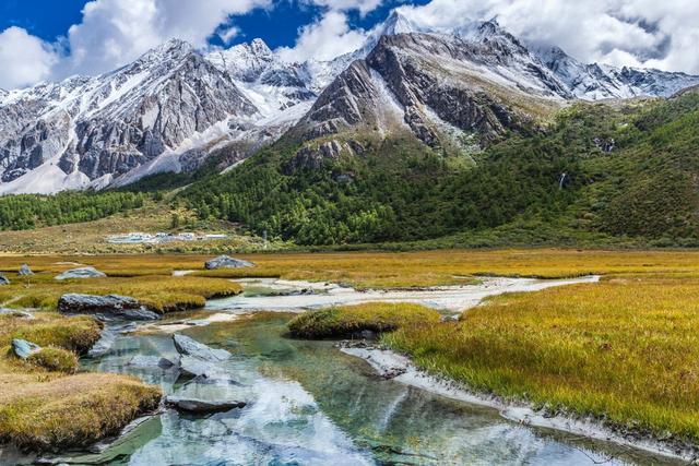此时红草地与黄色的万亩杨树林让稻城变成了色彩的海洋,亚丁在雪山、蓝天白云的衬托下,显得如梦如幻。