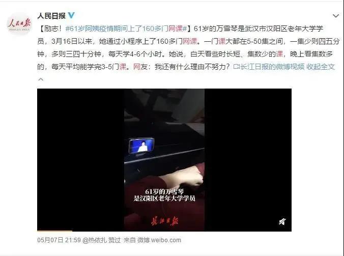 老了,不一定是“苏大强”般的孤独,还可以做快乐潇洒的老爷爷老奶奶!疫情期间,武汉61岁的阿姨万雪琴,她通过小程序上了160多门网课,被人民日报“点名”表扬。