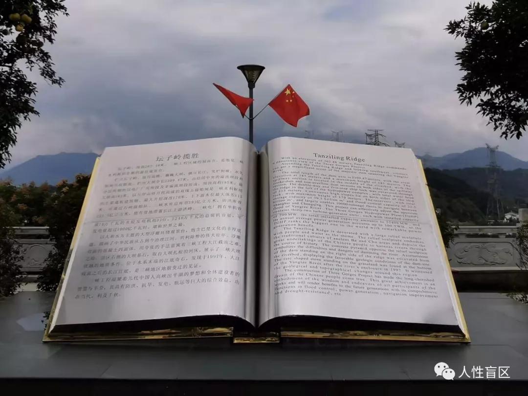 潭边摆放着一本石刻的,翻开着的大坝揽胜天书,2米多高近3米宽。