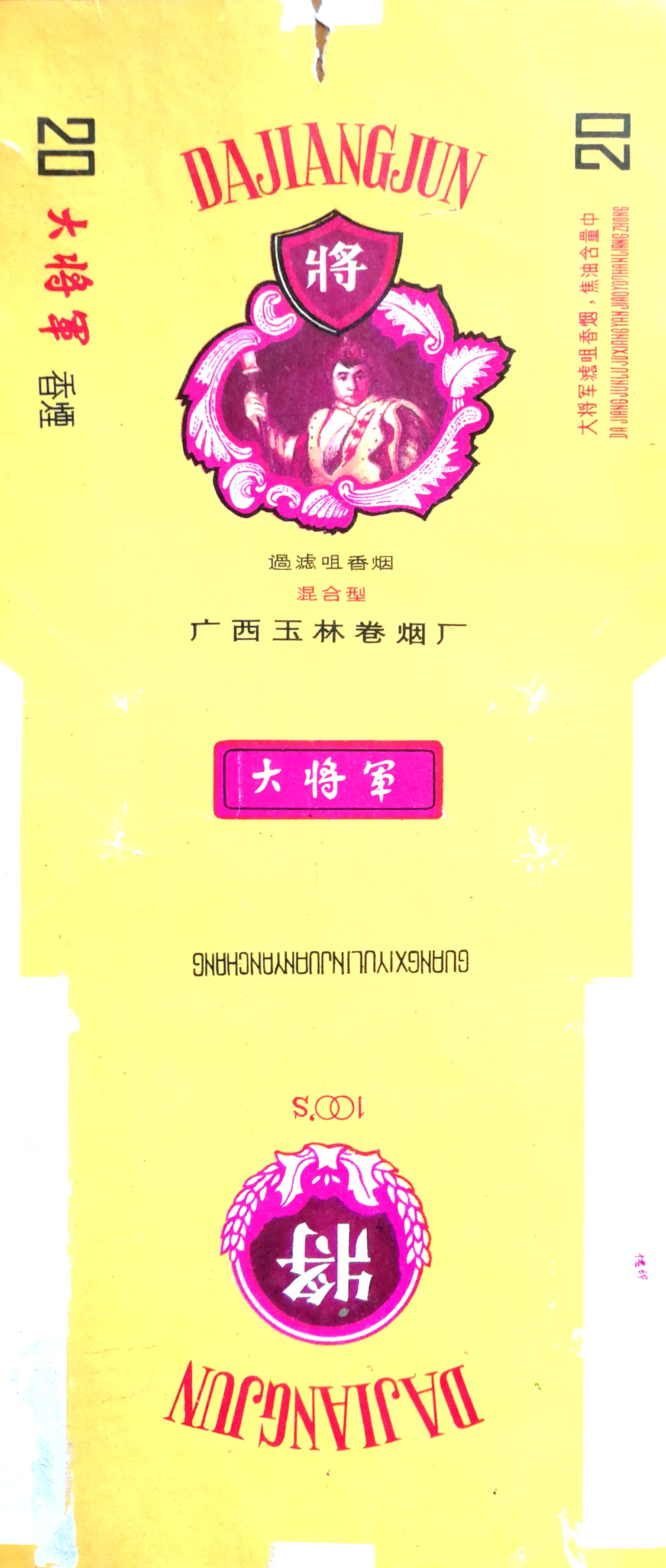 玉林烟厂八十年代初,″借鉴效仿”【大重九】烟标图案,推出【大将军】品牌,直接将”蔡将军”肖像,嵌入主图。此标虽有抄袭套用之嫌,却也让人们更多地铭记了【大重九】【大将军】的一段历史和人物。