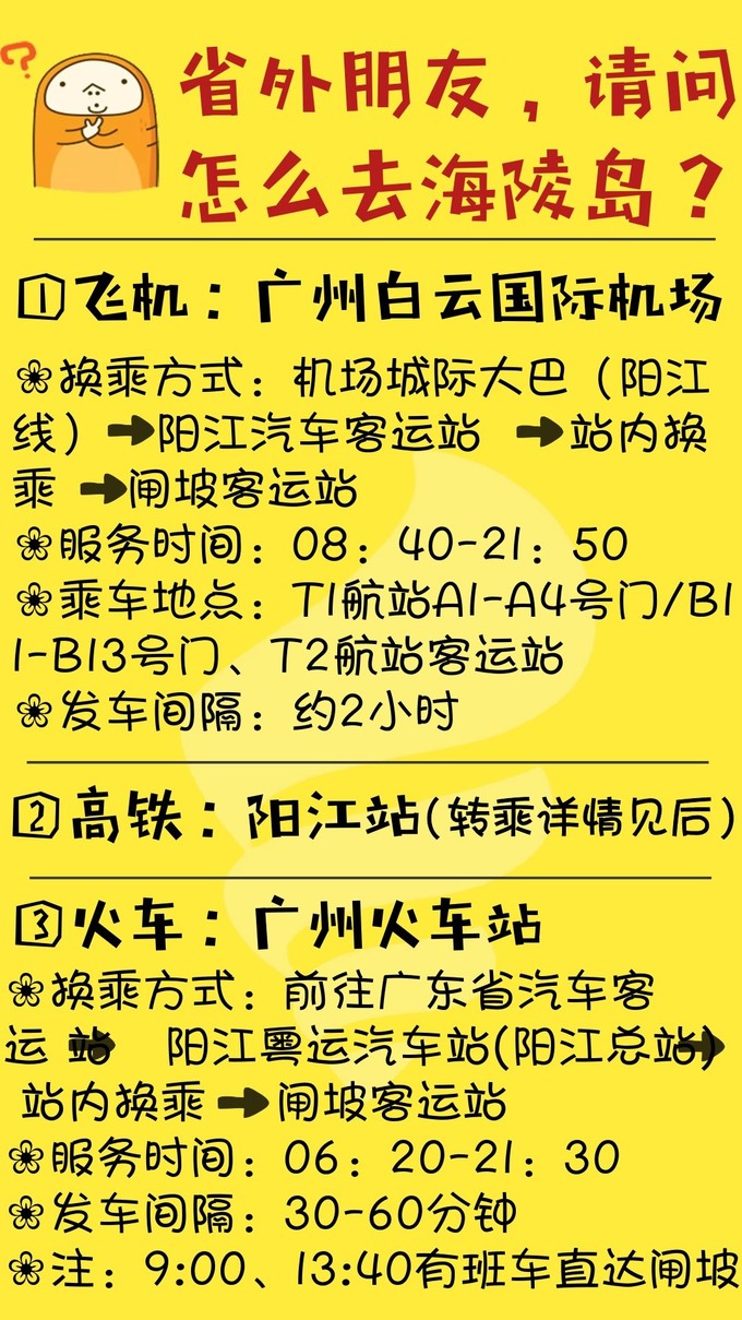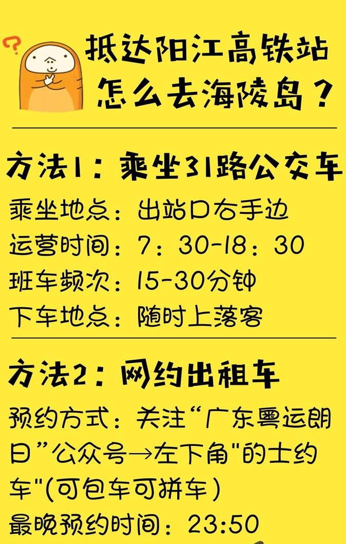 1.广州白云机场(白云机场地铁站—广州南高铁站 :地铁用时约80分钟,10元/人)—阳江高铁站(耗时1小时30分钟,高铁二等座104/122元/人 51趟动车)
