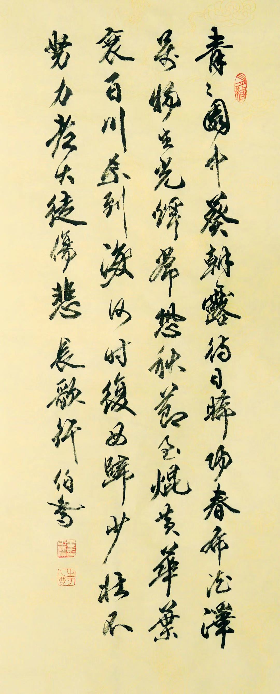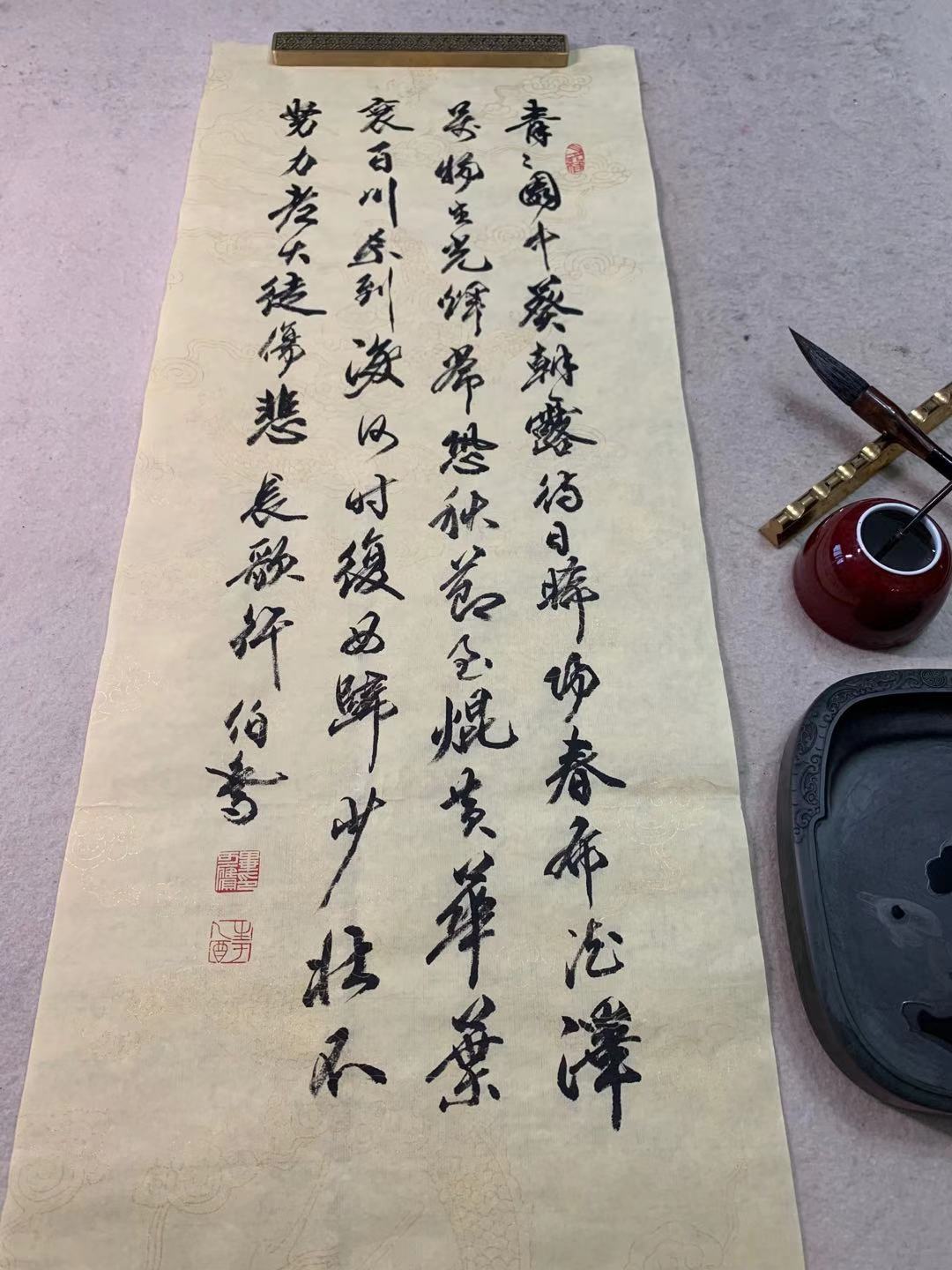 《长歌行》行书小作品,30×75,用高仿宋徽宗宣和描龙图案宣纸。小品一定要精美耐看,有节奏和韵律。