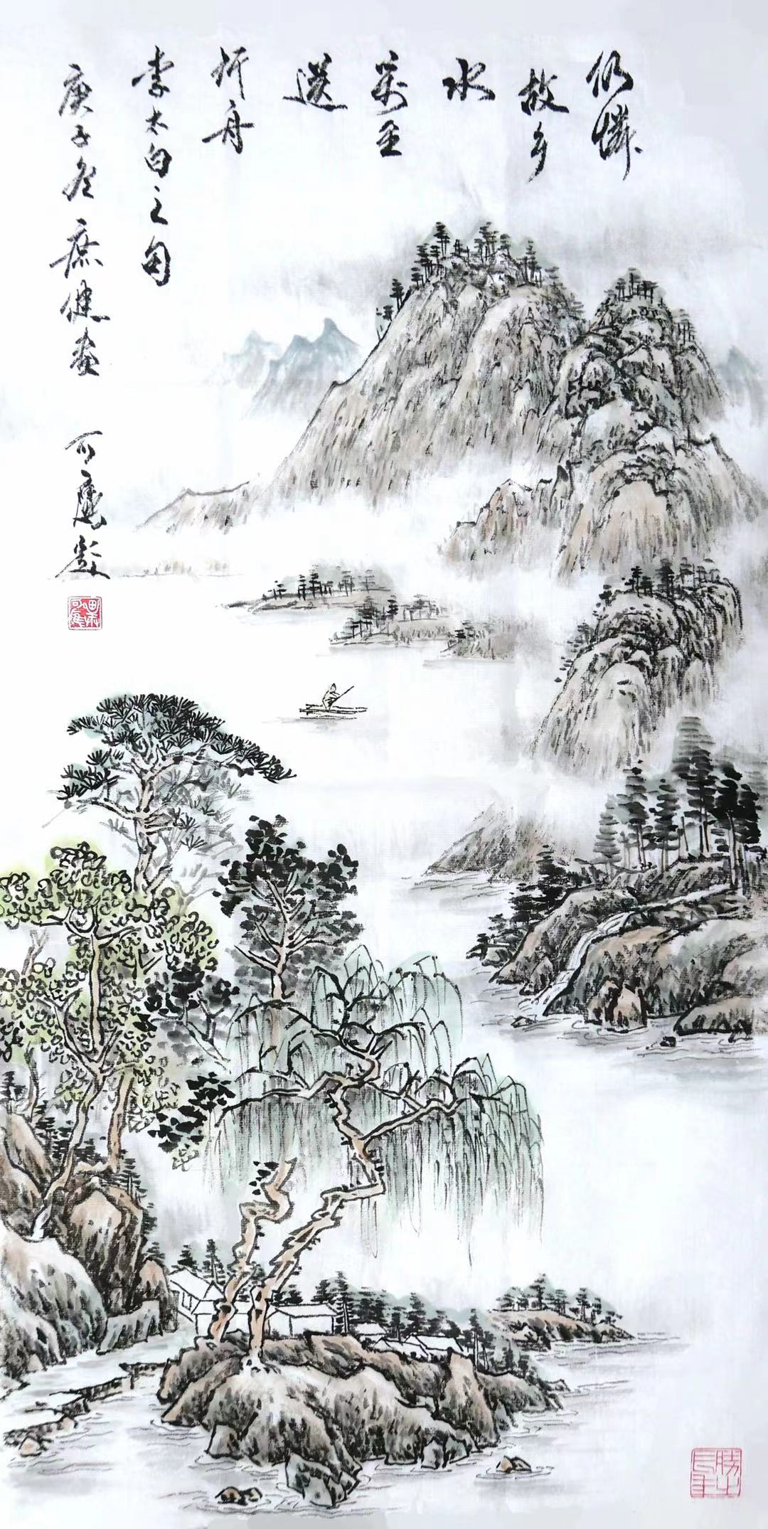 为毕庶健叔叔山水画题款:仍怜故乡水,万里送行舟(李白)