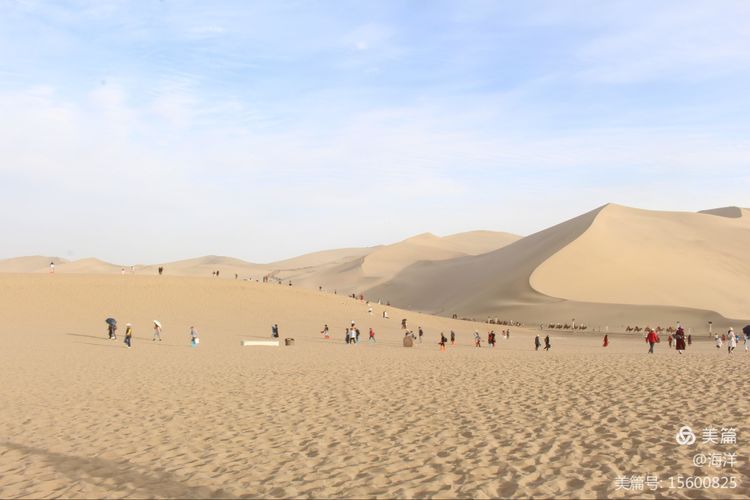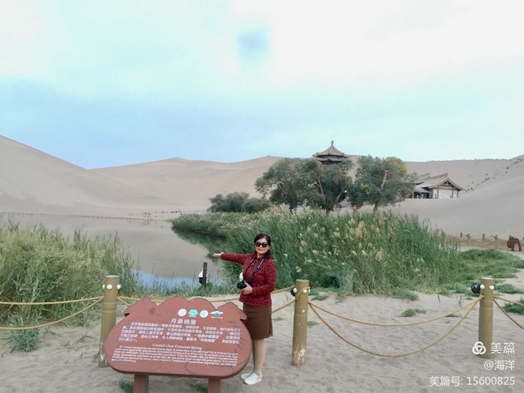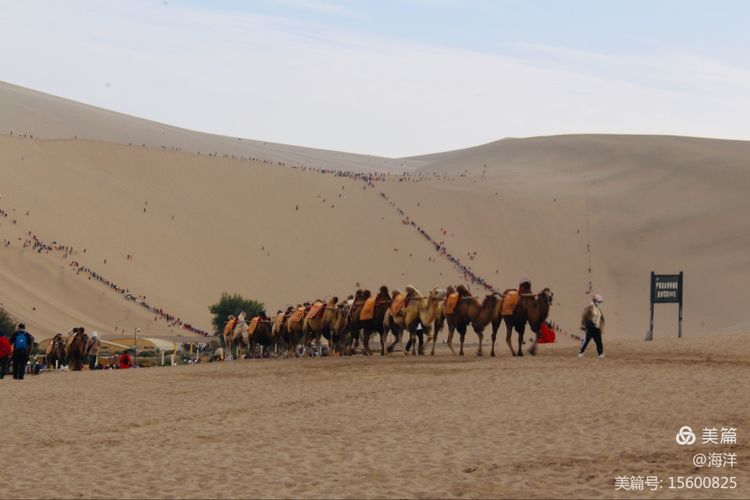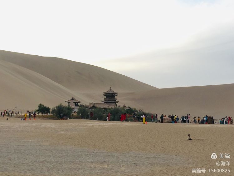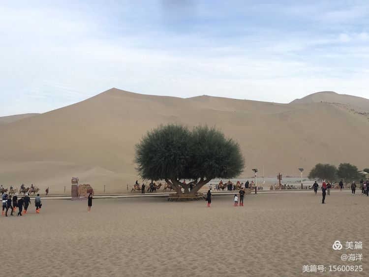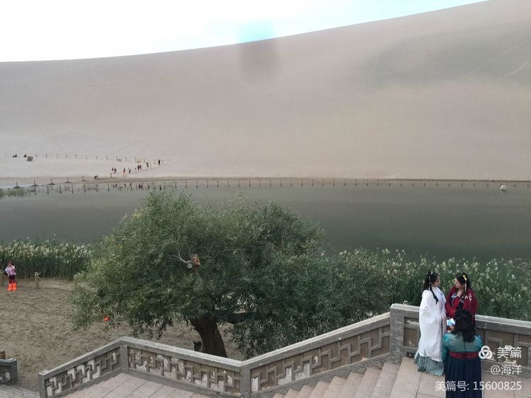 来到了鸣沙山月牙泉风景区,看到游客们兴致勃勃的去骑骆驼感受这沙漠中的奇妙,不枉此行。但由于我们都穿着裙子,要骑到驼背上去会诸多不便,只能放弃这种体验,好在我们在撒哈拉沙漠体验过这种感觉,故也不作为遗憾了。