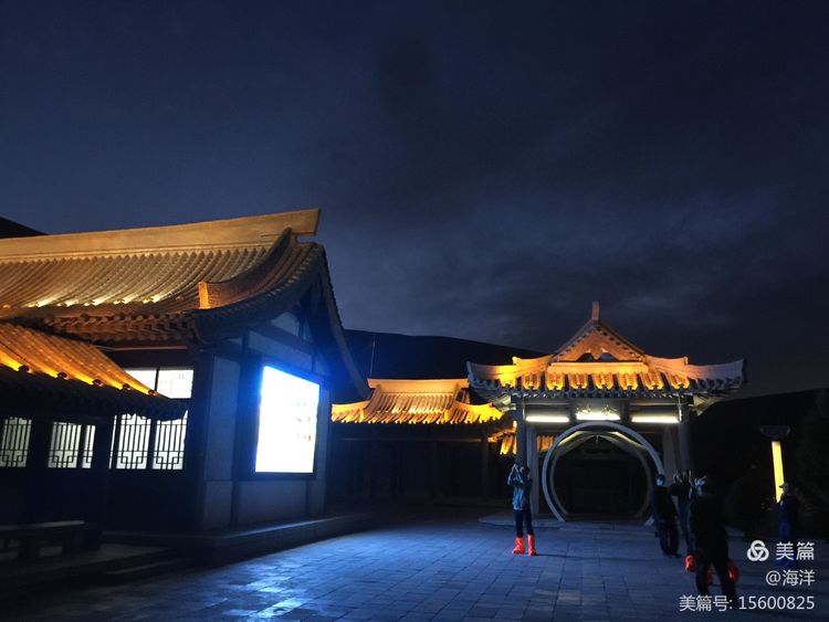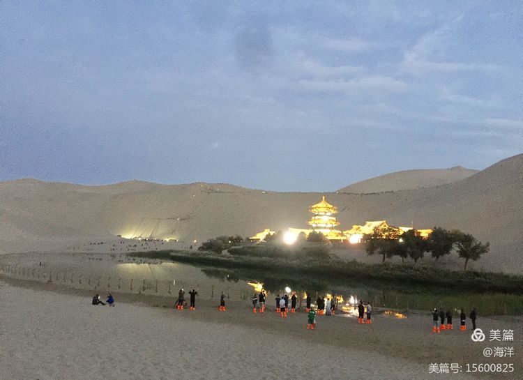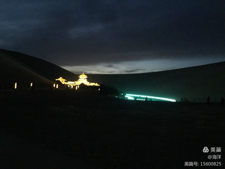 一轮明月高高的挂在沙丘之上,在夜色朦胧,灯光辉映下,构成了一幅独特的迷人夜景,白天的喧闹,在此时也归于沉寂。明晨,一轮红日会高高升起在沙丘的东方之上,新的一天即将来临,喧闹的一天又将迎来远方的客人,再见,鸣沙山月牙泉,再见,美丽的敦煌沙漠!