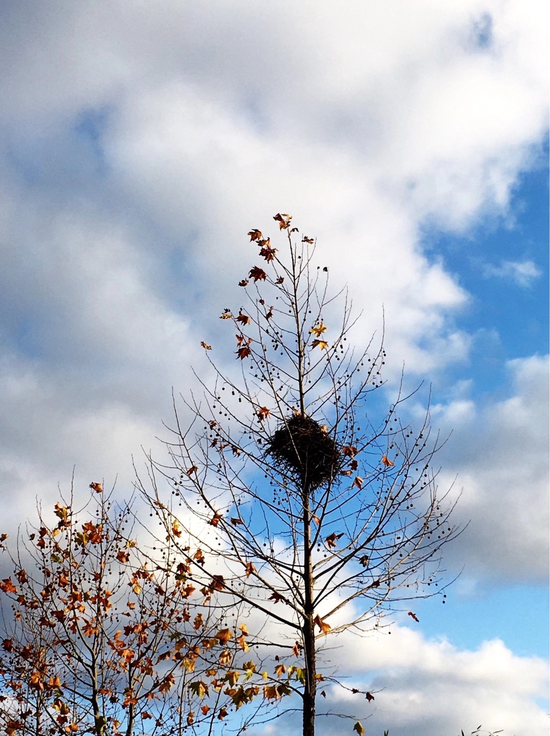 初冬,一场霏霏细雨,打落了树枝上仅存的一点黄叶,一只鸟窝裸露出来,孤独的挂在树梢上。这棵大树,在夏日里枝繁叶茂、郁郁葱茏,有鸟儿在唱歌,声音清脆、婉转。每当我从树下走过,就会侧耳凝听。今天,见到鸟窝,我才知晓了,原来这是鸟儿们的家。