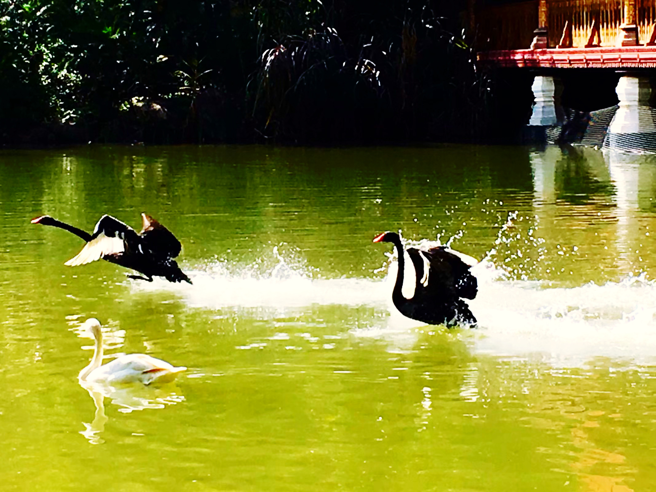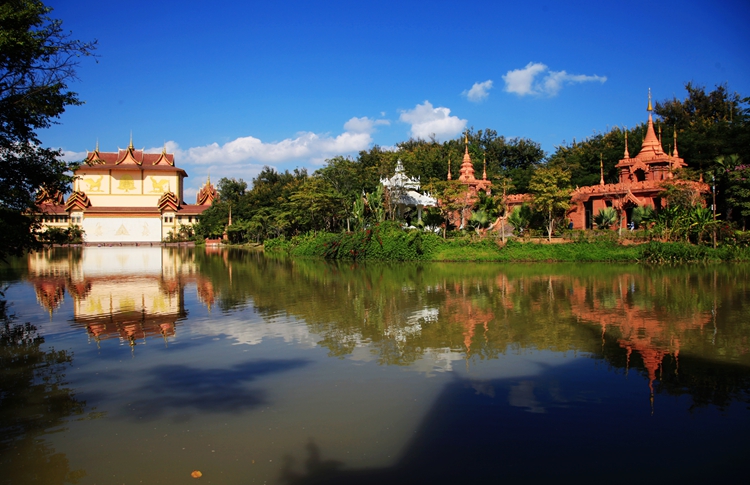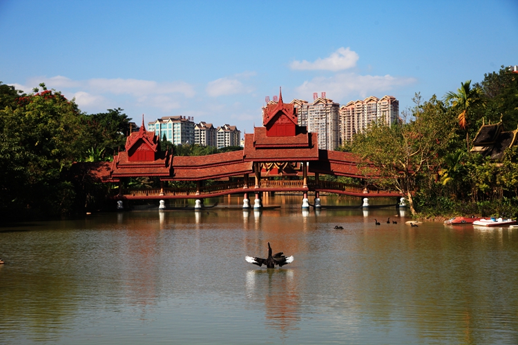 曼听公园里,美景如画,这是一个村寨式天然公园,园内植被茂盛,藤攀葛绕,奇花异草,五彩纷呈。里面有湖叫孔雀湖。湖水潺潺,天鹅游弋,小船悠悠。所有的景色都绕着河水铺展,景色会随天气而变化。有一次我遇到了好天气,湛蓝的天空,大朵的白去,碧绿的河水,天鹅飘来荡去,岸边青翠的树林,热烈的三角梅,古老的佛塔,像一幅美丽的画卷。而雨天则是另一番景像,氤氲的雾气笼罩在河面,天鹅若隐若现,两岸景色朦朦胧胧,犹如仙境一般。