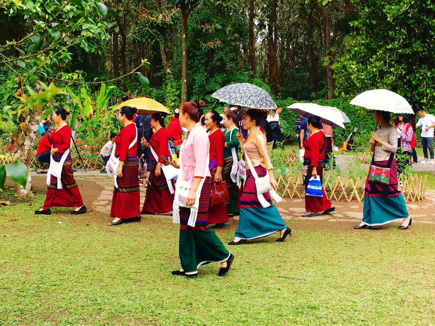 走进曼听公园,首先映入眼帘的是周总理泼水纪念铜像。铜像的后身有一座戏台,每天定点演出。演员装扮成傣王、王妃的模样,傣家姑娘穿着鲜艳的服饰,打着花伞,在台上载歌载舞,虽然她们唱的我听不懂,但还是能够看出表演的是傣皇宫的故事。