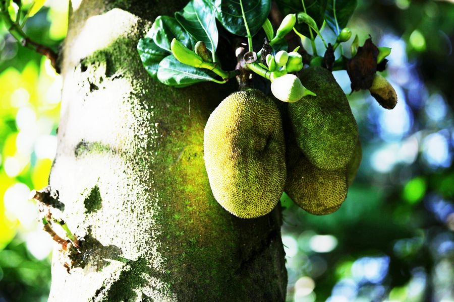穿过杨桃林遇见了菠萝蜜林,树上结着巨大的菠萝蜜果,让人担心它会掉下来。阳光透过树叶洒在地上,果园里静悄悄。我们在树下徘徊,用手托着菠萝蜜果拍照。这种水果我在三亚吃过,因太甜了,我不是很喜欢。走出菠萝蜜园发现道边有一个牌子,上面写着告示,不准摘水果,如被发现罚款。额的天,罪过,罪过,早知道,渴死也不吃的。我吓的心脏噗嗵乱跳,有种做贼被抓的感觉,心里忐忑不安。好在,游园结束,也没有人来抓,一颗心才放下了。回来想,这个园子没安摄像头,否则不挨罚才怪呢。