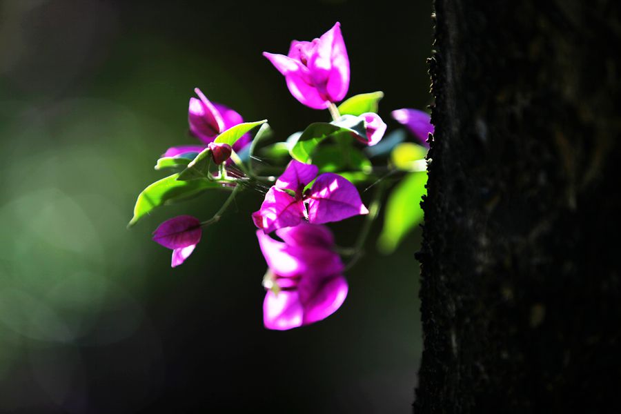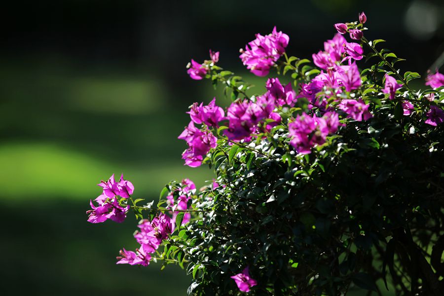 花卉园里还有三角梅园,三角梅花正热烈的怒放着,我们来时她就开放,离开版纳时她还在开放。娇媚的三角梅一簇簇憩在软软的枝条上,微风过处,枝条摇曳,那朵朵鲜红的花像小姑娘穿上红艳的裙子在摆动着柔美的腰肢。三角梅的花瓣较小,3朵聚拢在一起生长,故称三角梅。花卉园里的三角梅颇为壮观,色彩斑斓,浓浓烈烈,美不胜收。