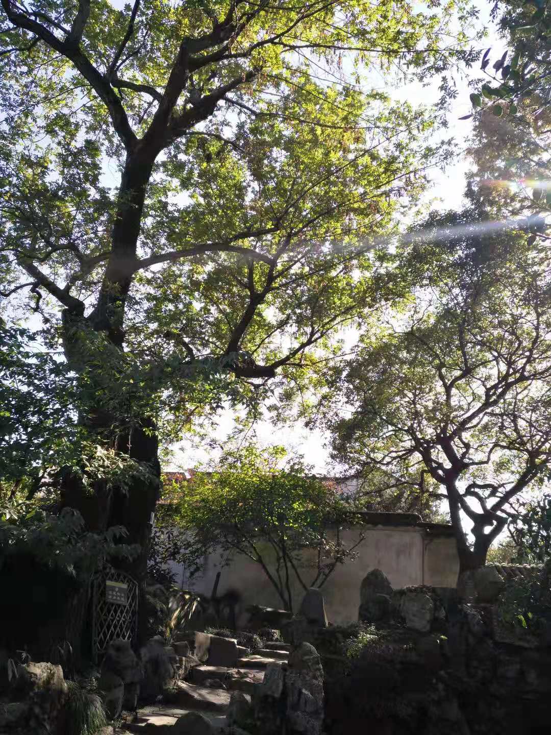 立冬这天上午,阳光依然温暖,走在林园石板阶梯上。霎那间,我惊讶了,看到了一棵为羽状复叶,绿得青葱,枝干、分叉许多,树冠呈伞状的枝繁叶茂的一棵参天大树。