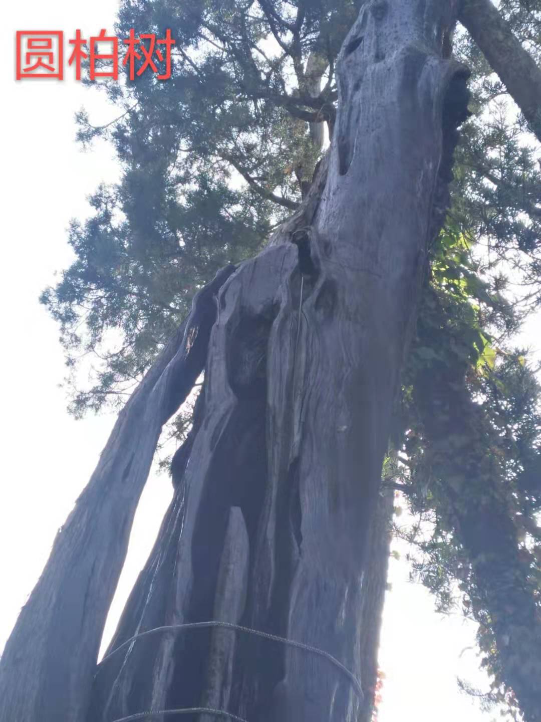 第二天上午,我来到了另一家林园,踏过三步桥,走过八角亭后,同伴对我说:“你看前面这棵树。”我急忙走进一看,瞬间惊呆了,这棵粗而高大又倾斜的树,从根部开始长度约3米树干似被锐器劈过几次,树干变成了名副其实的几条黑黝黝的,皱巴巴的,厚厚的树皮,磨难无限的这些树皮又支撑了这棵高耸的树。树的枝干、分叉你绕我,我绕你紧紧的交融在一起。密密麻麻的绿色松针,爬满了整个树干上,遮住了上方的一片蓝天。我看了树牌惊呆了,这棵圆柏树已经有930年了。