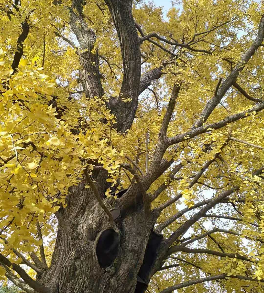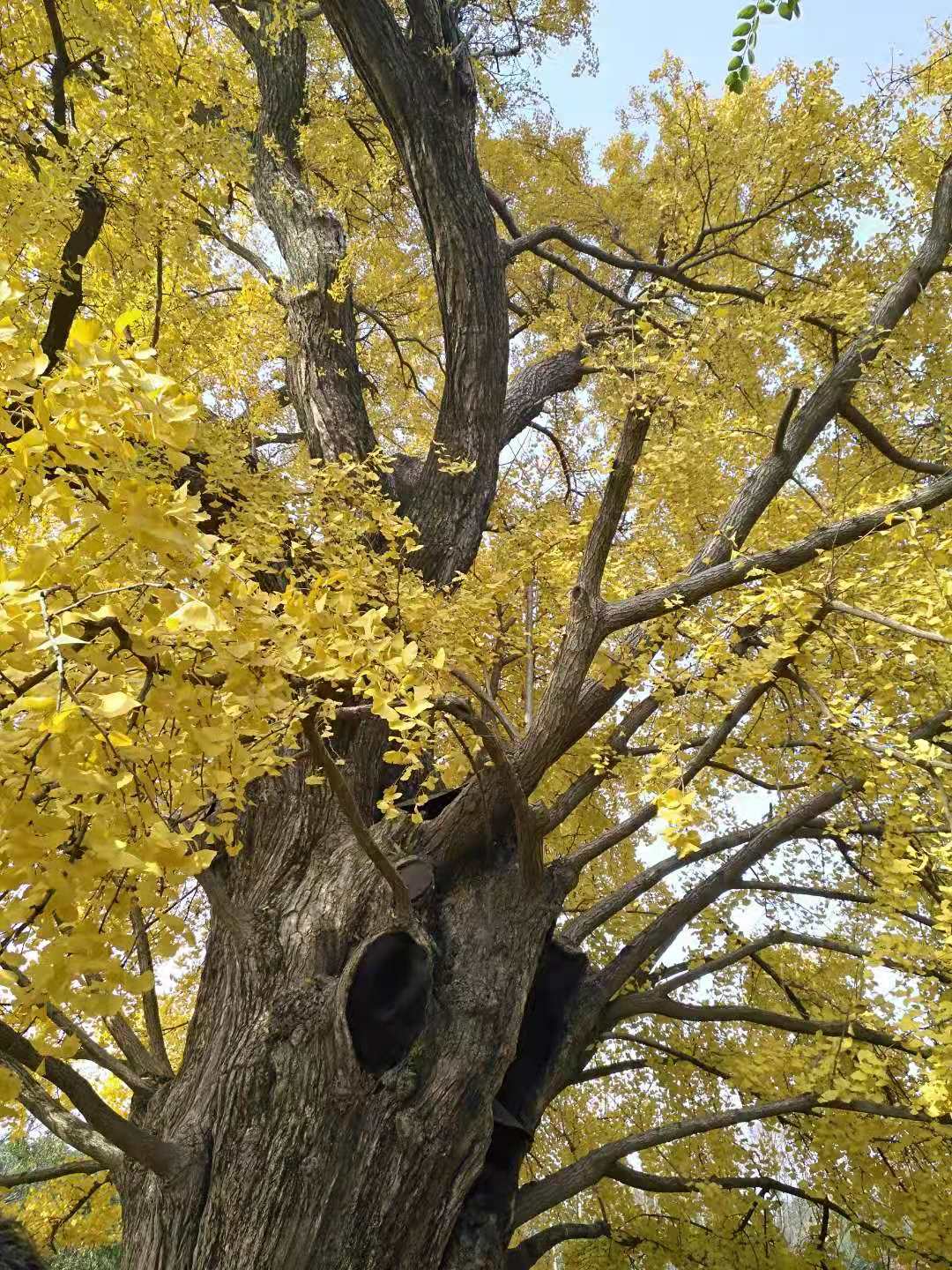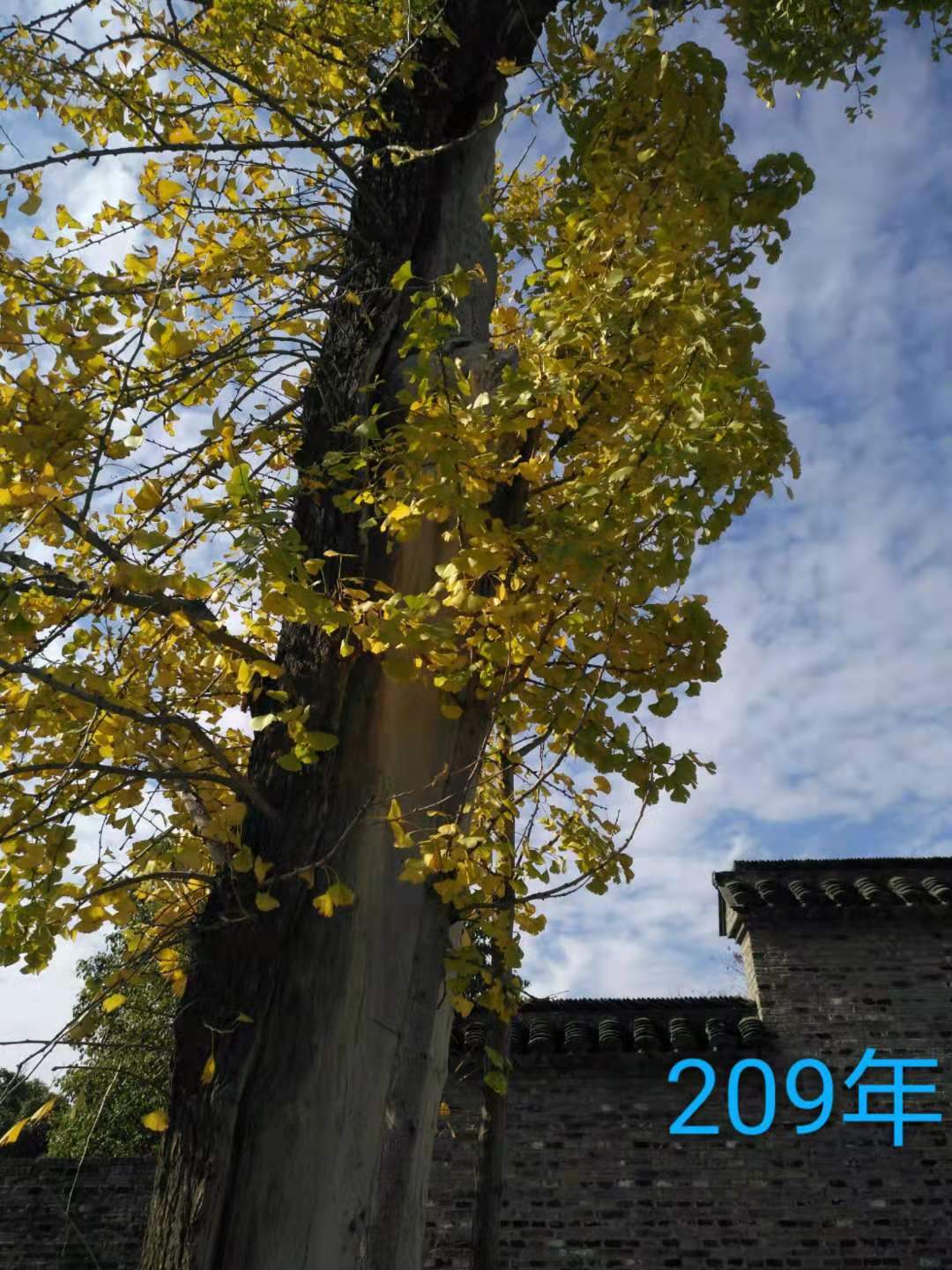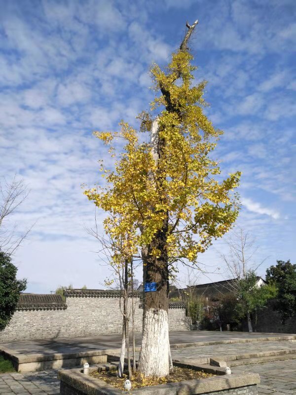 后来,我来到了一个古镇,准备穿过古镇广场时。刹那间,我看到了一棵黄灿灿的银杏树,它的叶子黄的那么鲜艳,娇嫩,通透,雪花似的白云在金黄色的银杏树上,而银杏叶子似黄色的蝴蝶在蓝天飞舞。我停留了好一会儿,仔仔细细看了又看,怎么也是一棵残缺不全的树?树干上有的地方树皮没有了,也有了树洞,再细细瞅瞅树牌,这棵银杏树已有209年了。