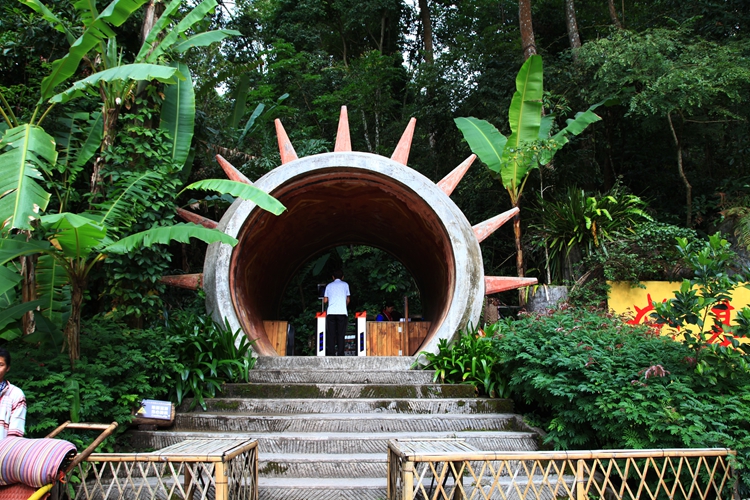 离开集市来到基诺山景区,一个大鼓形状的寨门映入眼帘。购买门票从鼓中穿过,既进入了寨子里。沿着长长的台阶拾级而上,头顶是遮天蔽日的热带阔叶大树,宽大的芭蕉叶低垂到手边,枝头倒挂着大串大串饱满的芭蕉,低处的紫花藤条肆意地伸展。台阶上绿草茵茵,蓬勃的生命呼之欲出。