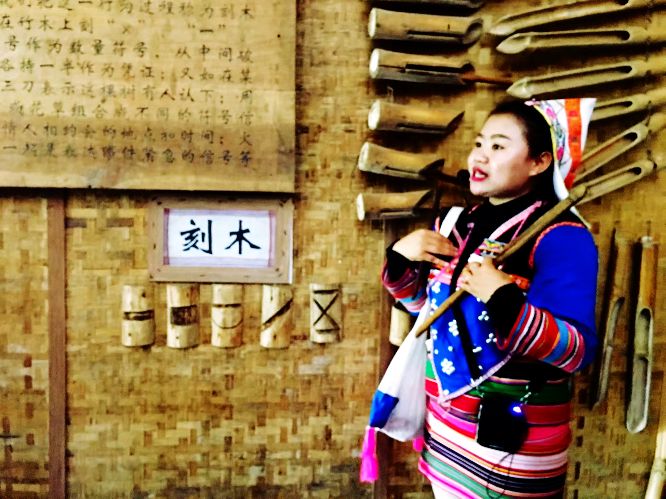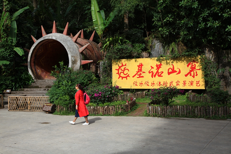 带我们进来的讲解员是基诺族姑娘,路上滔滔不绝介绍基诺族历史。她说“史前洪水泛滥时,一对兄妹躲在大鼓里逃过了劫难,洪水退去后,兄妹从大鼓中走出来,繁衍生息,演变成现在的基诺族。所以基诺人相信自己是从大鼓里走出来的民族。”听到这里,我恍然大悟,怪不得寨门做成大鼓形状呢,原来是有寓意的啊。
