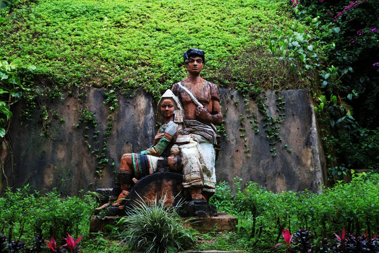 游客们边听讲解边走路,远远地有一对年轻男女的塑像耸立在台阶上,走近了才看出这就是前面故事的主角——大鼓里走出的兄妹夫妻。他们是基诺族的祖先,男的叫玛黑,女的叫玛妞。所以对于后代来说,玛黑既是父亲也是舅舅。因此这个民族就被称为“舅舅的后代”,“基诺”这个词就是基诺语里“舅舅的后代”的意思。
