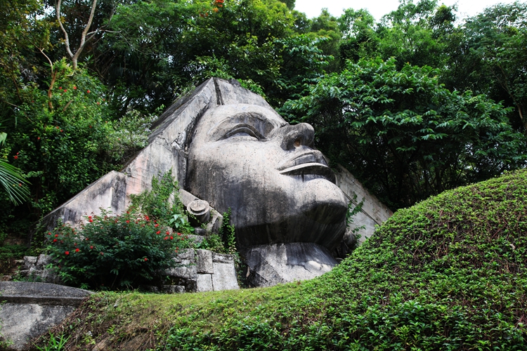 在这尊塑像的上方,有一个巨大的躺卧着的石雕女性雕像,这是基诺族最为崇敬的创世女神阿嫫腰北。阿嫫意为母亲,腰北意为创造大地,既创世女神,就像女娲一样,她创造了万物。不幸的是这位女神在第二次创世的过程中遇难身亡。为了纪念这位女神,基诺族的女子也都戴着和阿嫫腰北一样的尖尖的白帽子。