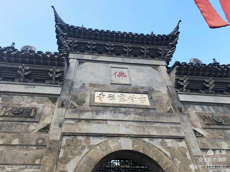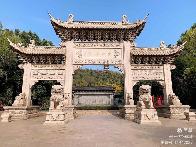 牌坊背面额枋“汉晋遗风”,乃原金山江天禅寺、江苏省佛教协会会长慈舟书。配的对联是“泉声鸟声钟鼓声声声是幻,山色云色草木色色色皆空。”