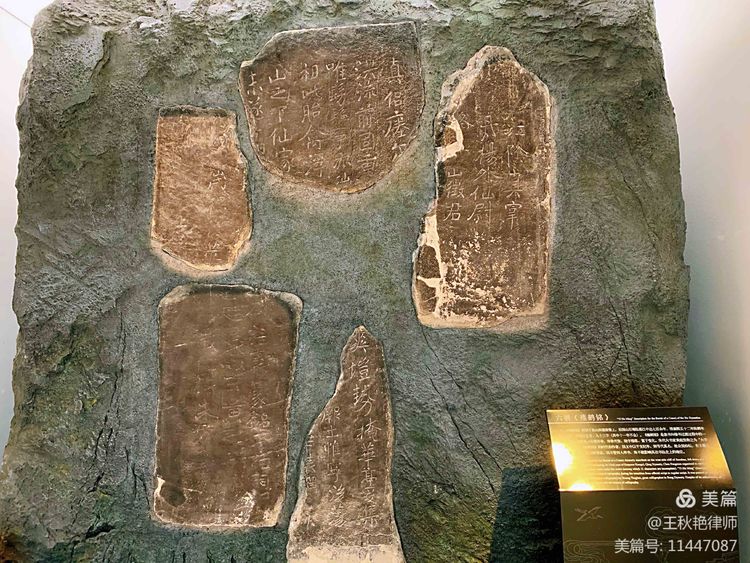 焦山碑林珍藏历代碑刻四百多余方,仅次于西安碑林,是江南第一大碑林。其中最有名的就要数《瘗(yì)鹤铭》,其内容是说一个书法家,家养的仙鹤死了,写了一篇纪念的铭文。原刻于焦山西麓崖壁上,后山石塌落坠入江中七百余年,清康熙五十二年陈鹏年雇人打捞,得残片五片,九十三字。是隶书向楷书过渡过程中的字体,行笔雄健,方圆并举,体势开张,结字错落,富于变化,宋代大书法家黄庭坚称之为“大字之祖”。