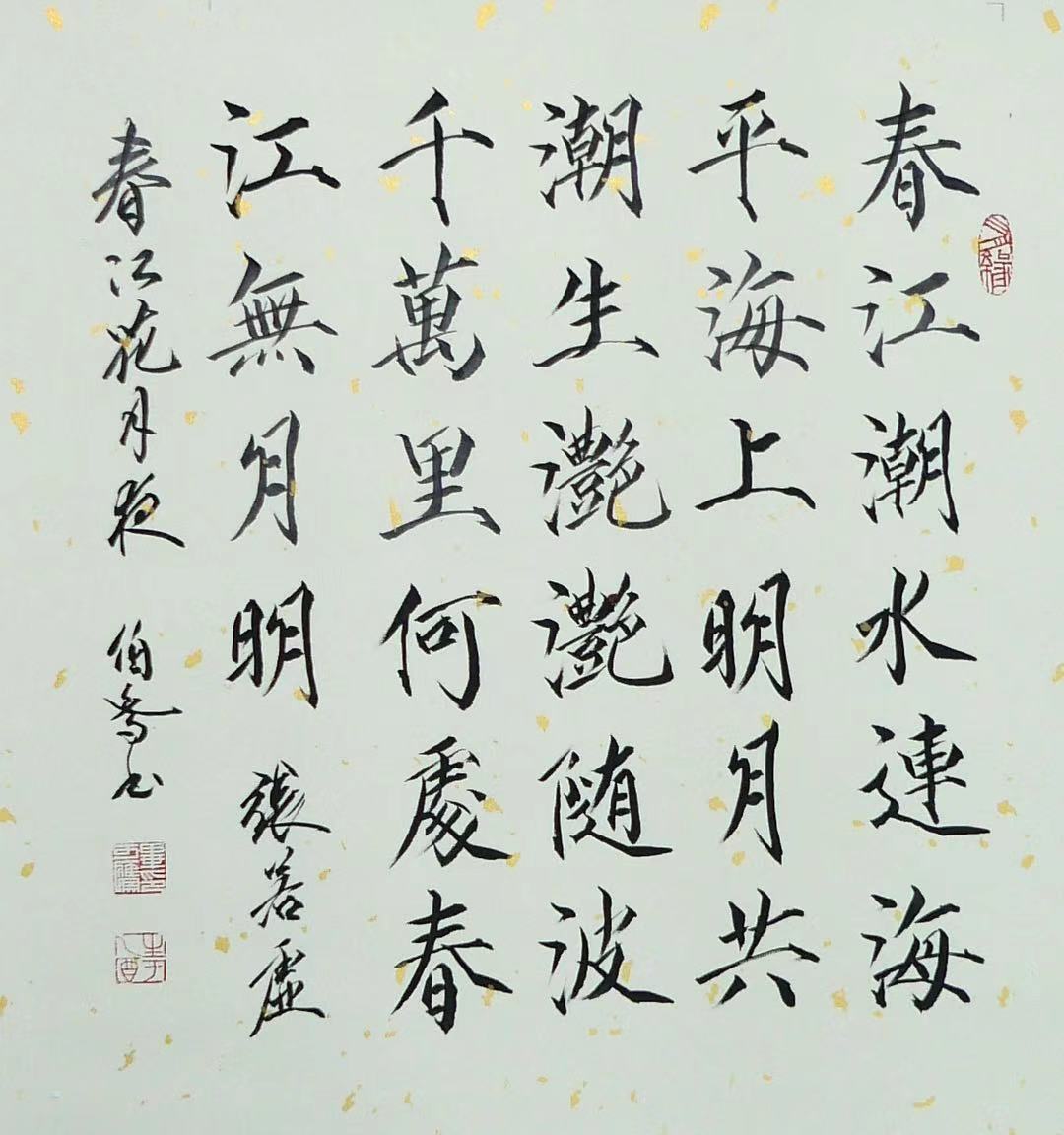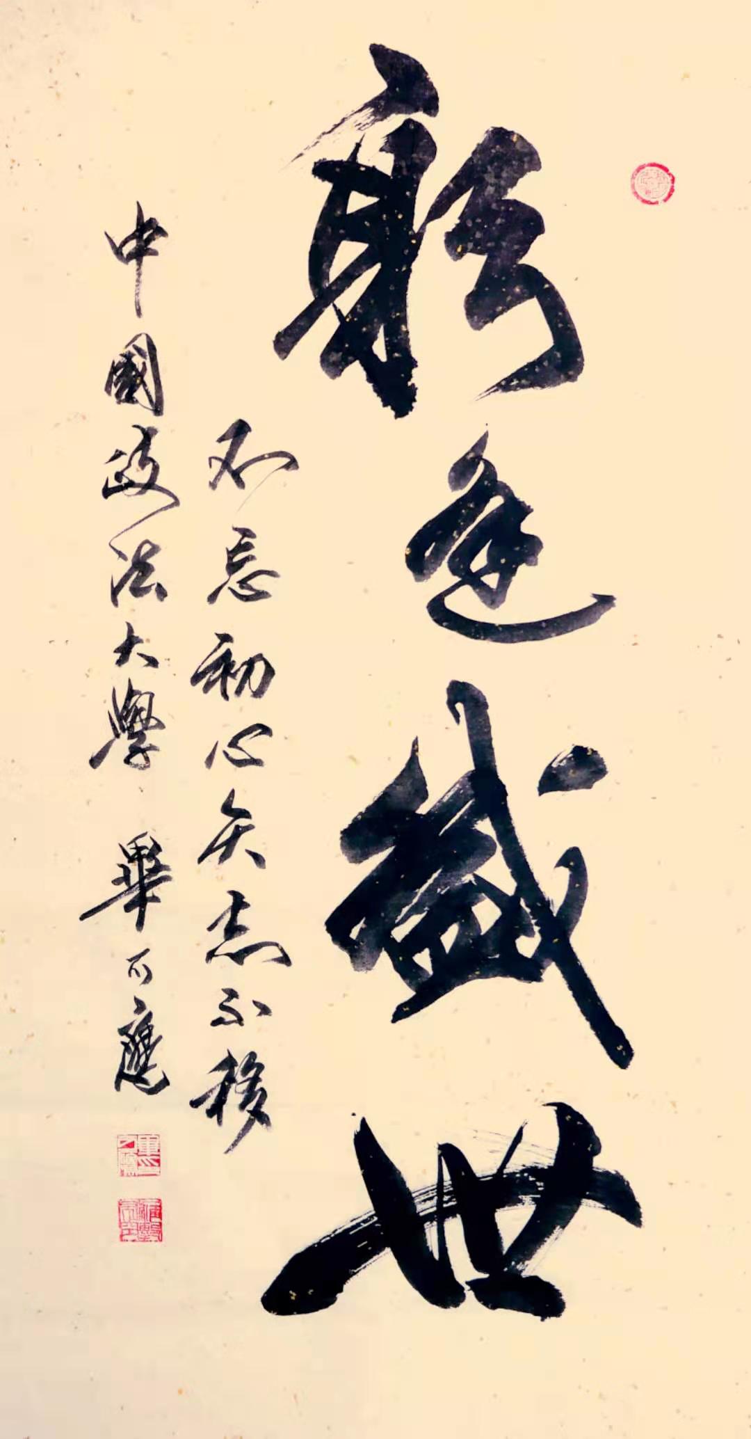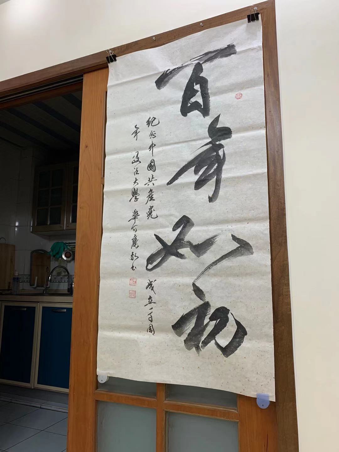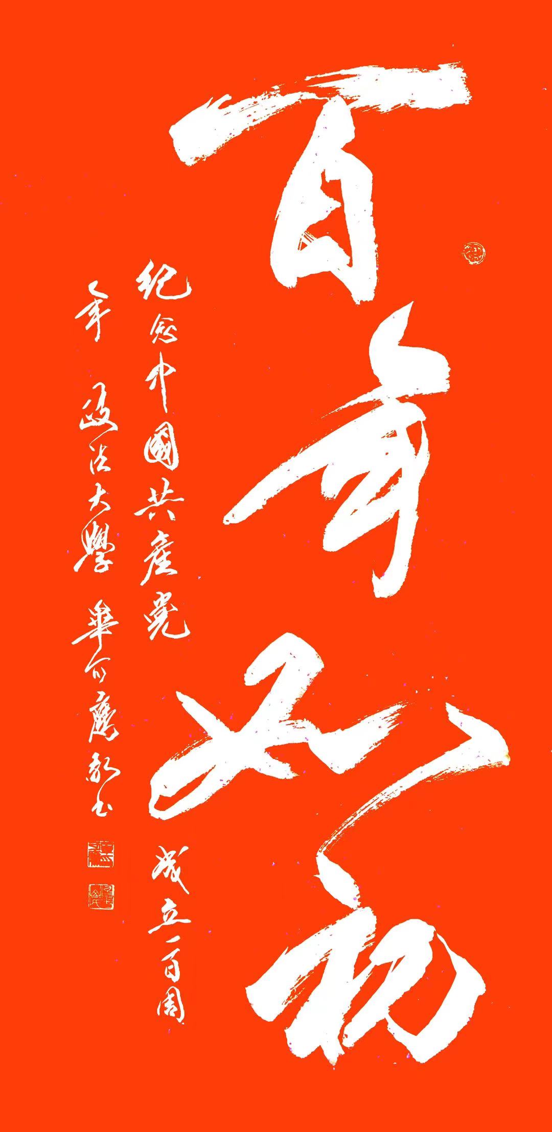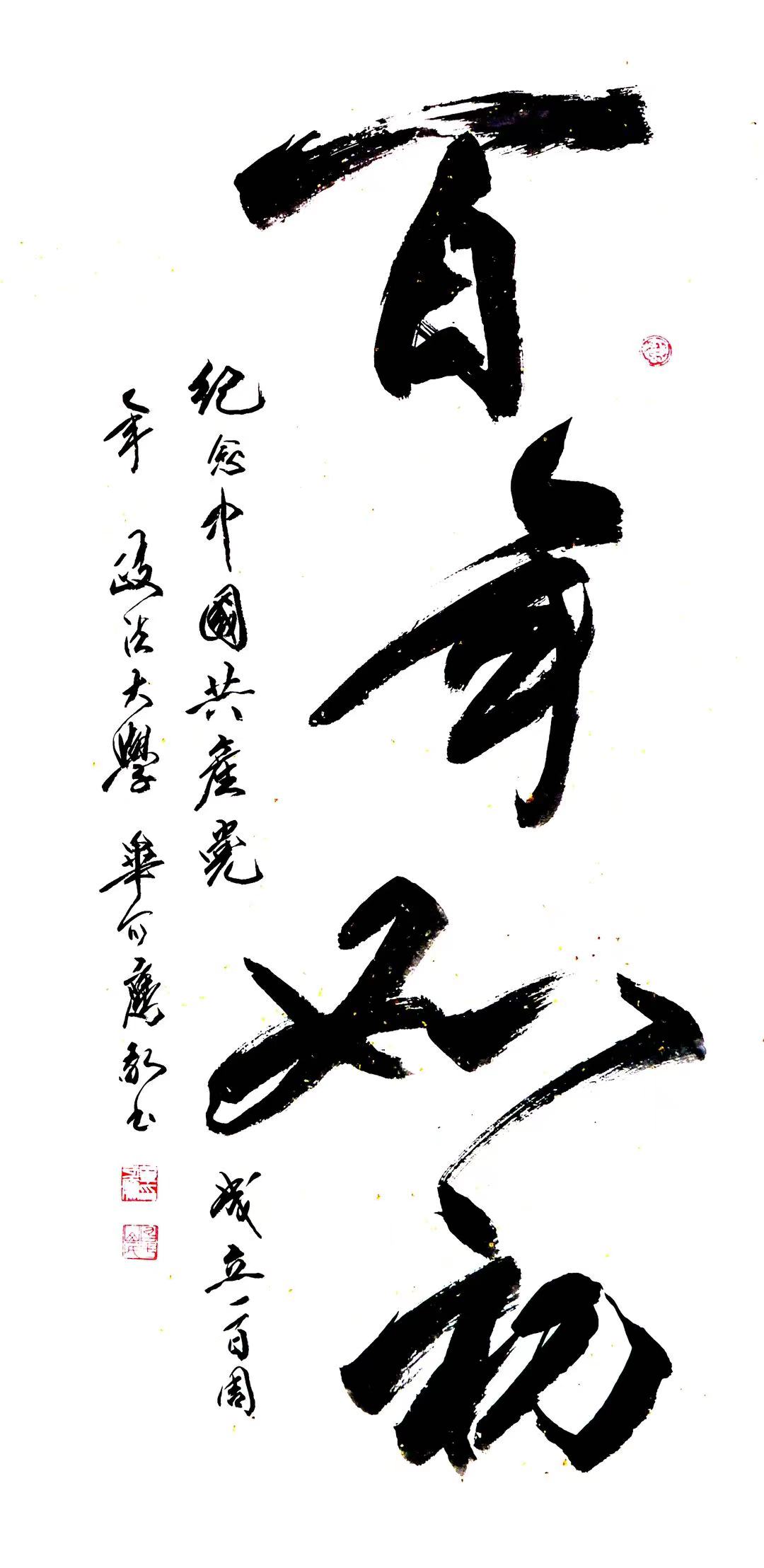 准备建党100周年作品,正文:百年如初 落款:纪念中国共产党成立一百周年 中国政法大学 毕可鹰敬书 四尺中堂(65×130);洒金仿古宣纸
