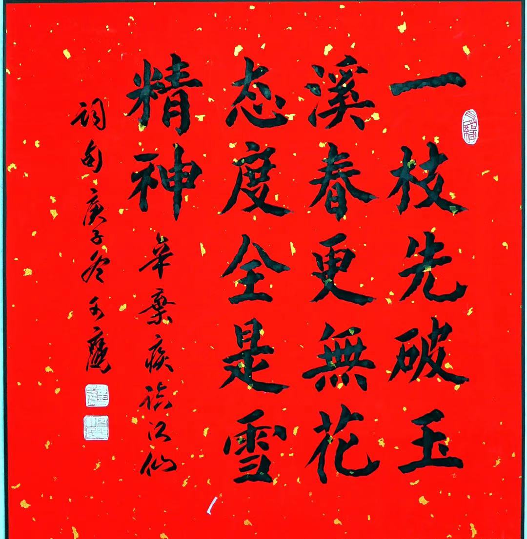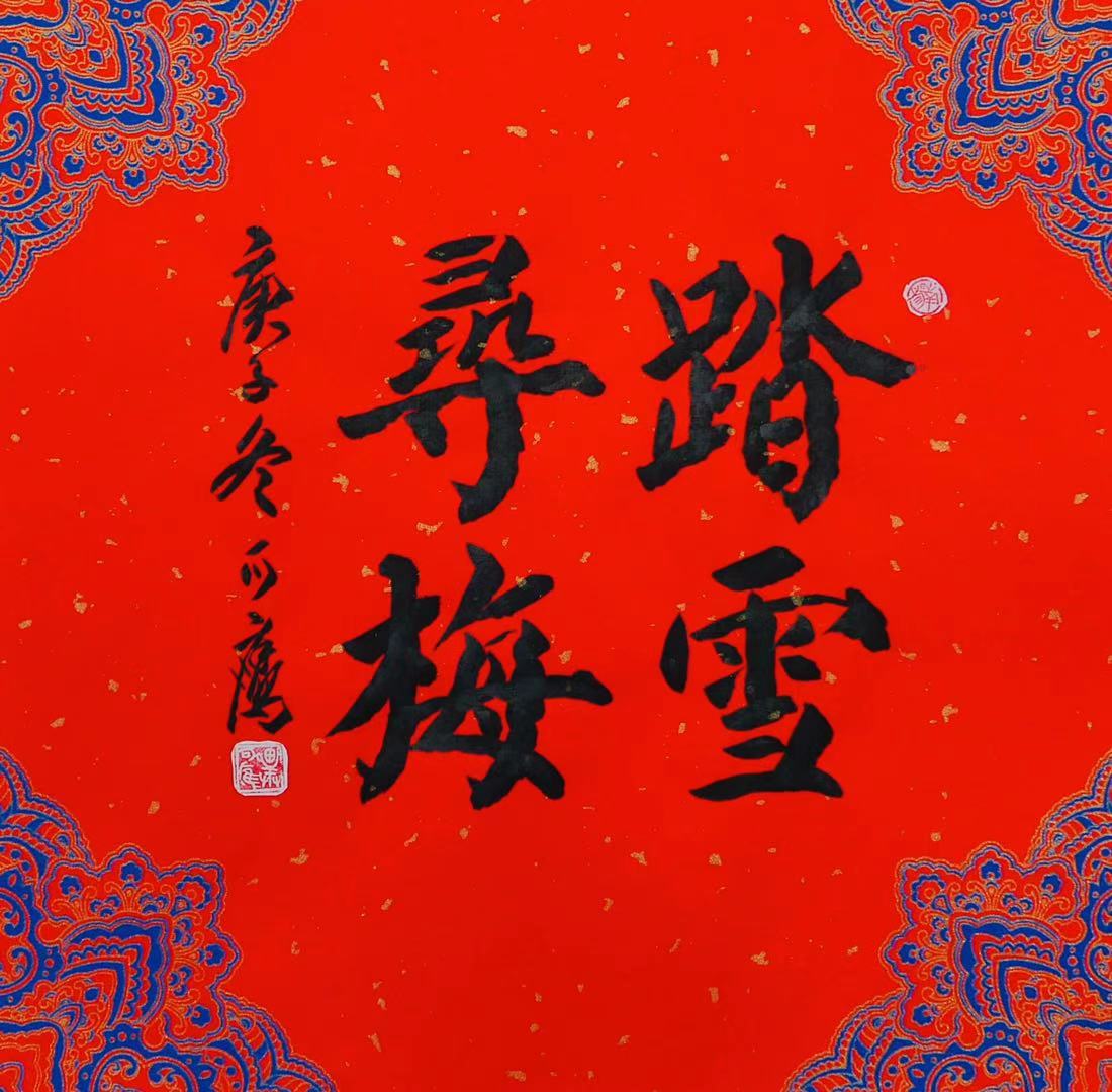用“宫廷”大红斗方宣纸写颜体楷书:踏雪寻梅