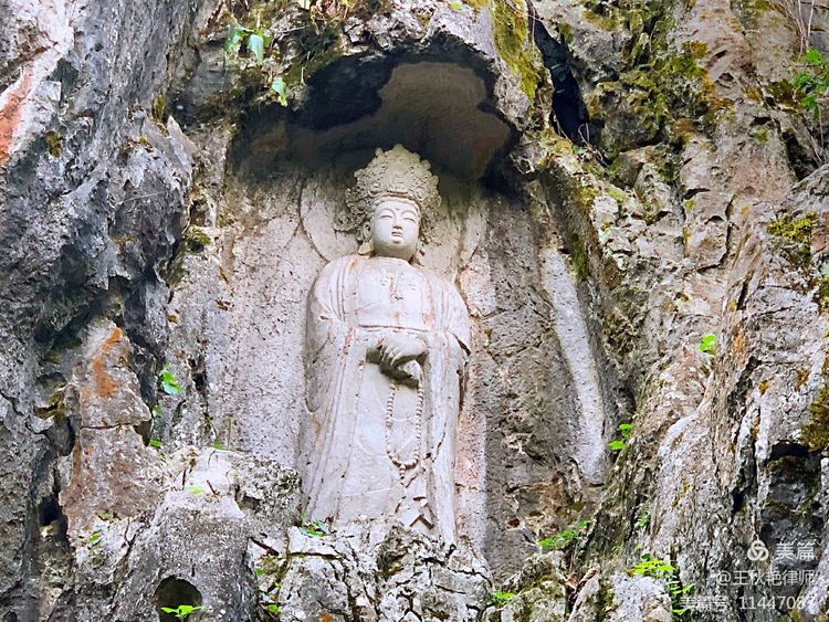 进景区后,先映入眼帘的,是飞来峰造像群。在飞来峰的主要岩洞及沿溪峭壁上,共刻有保存较完整的石刻造像300余尊。佛菩萨们或庄严,或微笑,或闭目,或俯视,或坐,或立,无不形象生动,服饰、宝冠皆细腻精美,历经这么多年的风雨,虽已斑驳,但依然动人。