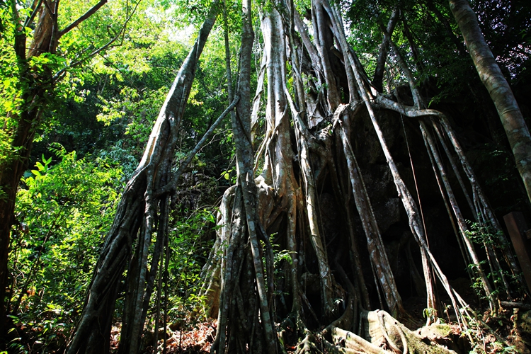 在西区游览完,坐电瓶车来到东区。东区是一片原生态雨林,面积非常大。在这里参观需要爬山,我们跟在人群后面,沿着山路攀登,途中看了“绞杀树、大板根、树瀑布”三处景点就到达山顶。从山顶鸟瞰,山下是罗梭江,江边有个傣族村寨,群山环绕,景色秀丽。东区还有个著名的景点绿石林我们没有去,因爬山爬累了,实在走不动路,所以放弃了。