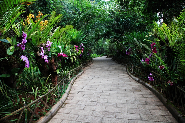 走进园林坐电瓶车直奔西区。沿途,郁郁葱葱的森林,有孔雀跳来跳去。青山绿水,奇花异木,充满着勃勃生机。这里的自然环境非常好,听说景区里有3000多种国内外热带、亚热带植物,是一个以热带雨林为主,集科研、植物种质保存、科普和生态旅游为一体的中国最大植物园。