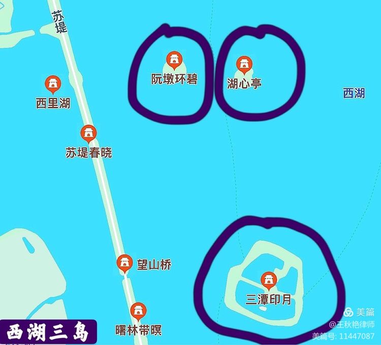 “三岛”是小瀛洲、湖心亭和阮公墩。(目前,对游人开放的只有小瀛洲,湖心亭和阮公墩出于环保考虑,对游人关闭了。)