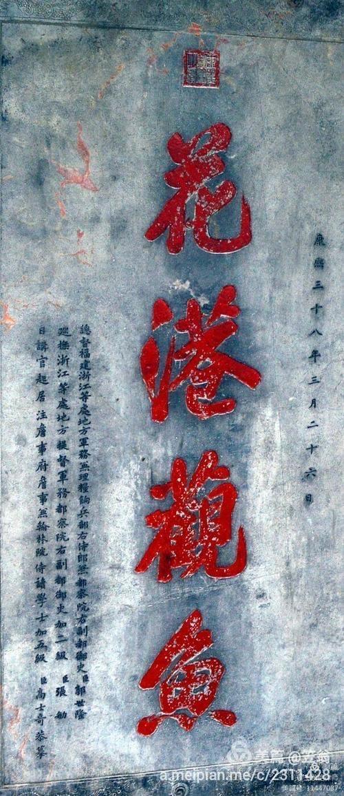 7. “花港观鱼”在苏堤映波桥西北约200米处,介于小南湖与西里湖之间。需要提醒的是,繁体汉字的鱼字,下面是四点,可此处碑刻上的“鱼”字底部只有三点。原来,碑上所刻四字是清朝康熙皇帝手迹,康熙信奉佛教,崇尚好生之德。在汉字里,三点为水,四点为火。“鱼” 字底部是四点,鱼遇火必死,遇水则生。康熙帝不想鱼死,为示其好生之意,才故意将“鱼”字底部的四点改写成三点,希望鱼儿永远快乐地游在水中。