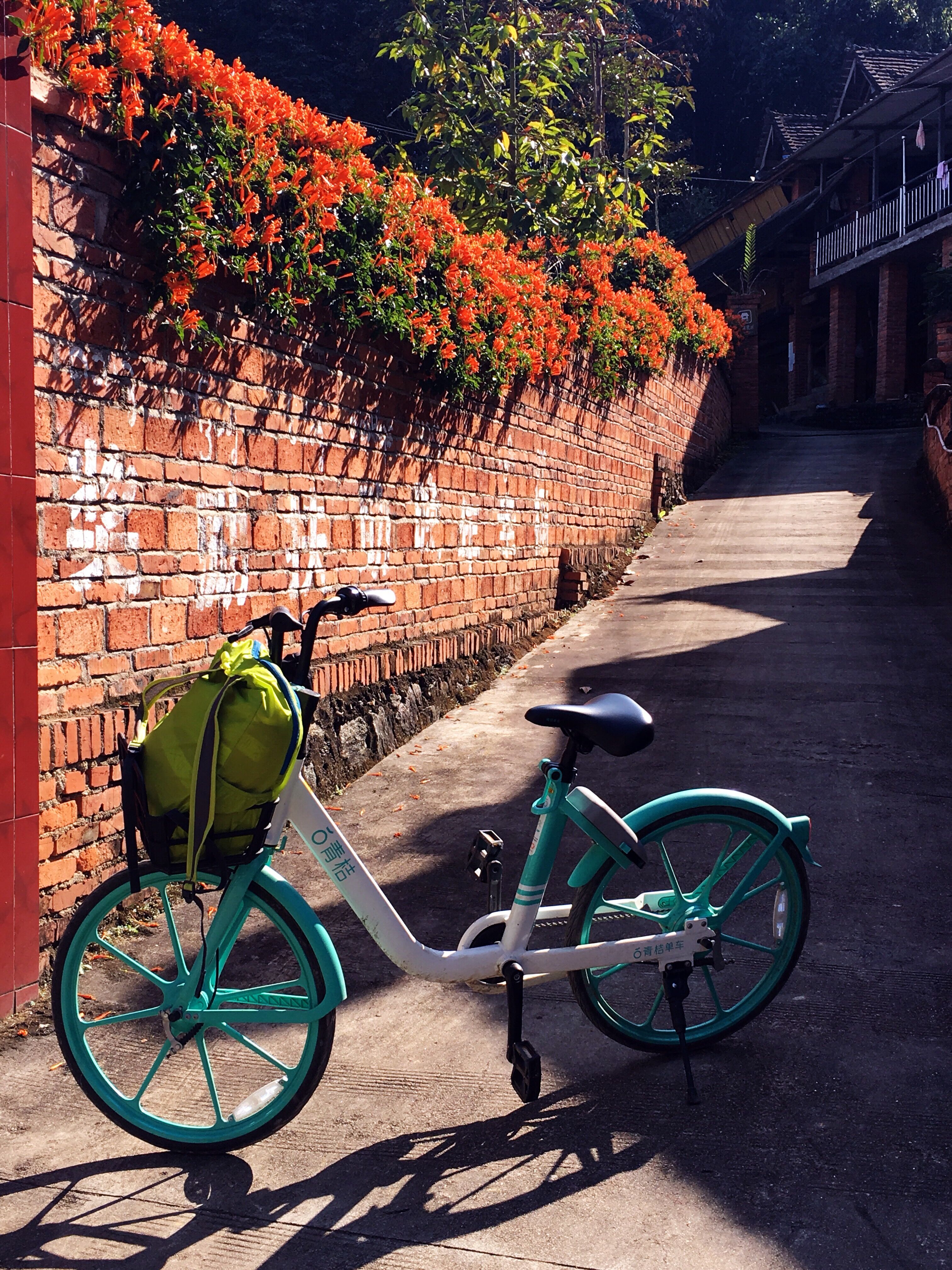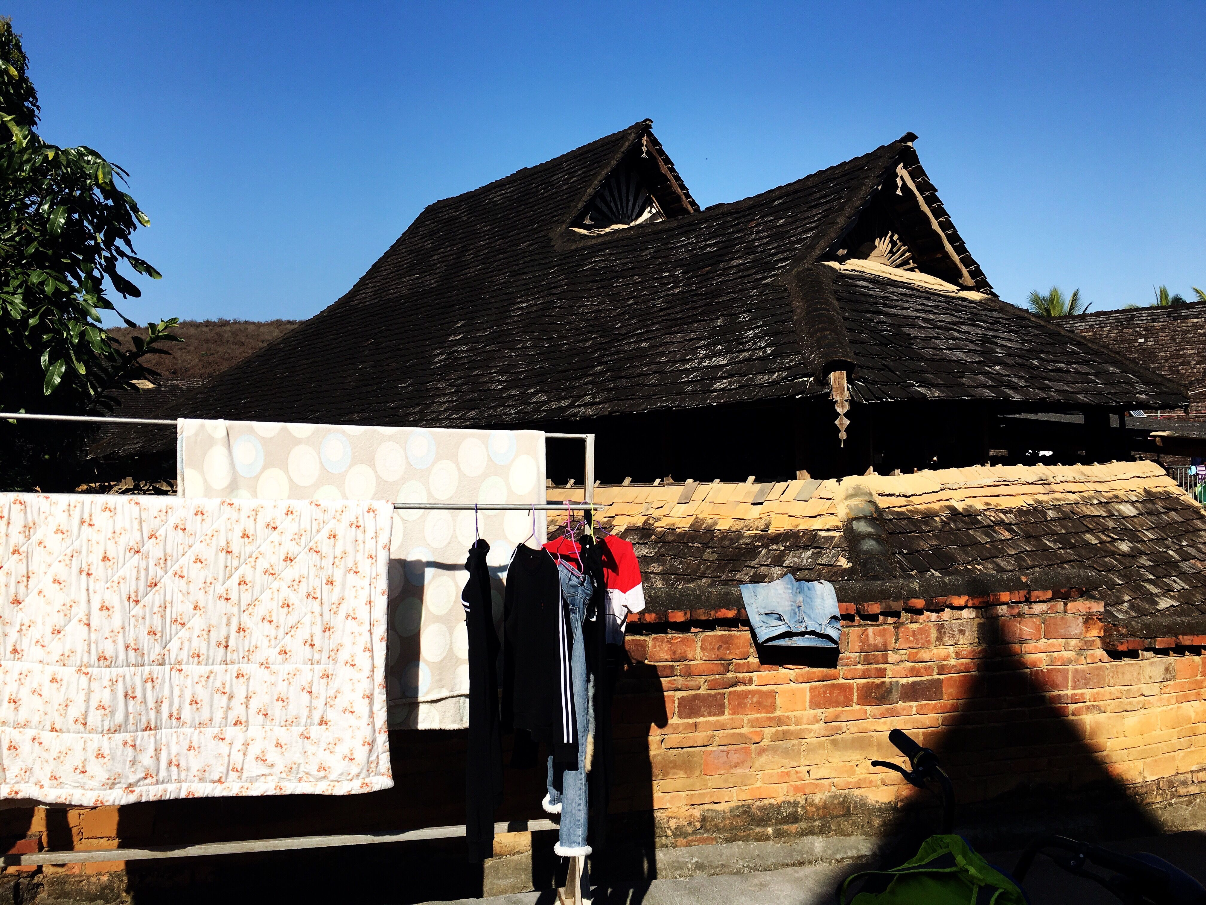 曼丢村头有一座池塘,被小路一分为二,池水清澈,青山倒影。整个寨子掩映在椰子树和棕榈树中,清一色黑平瓦的人字型屋顶若隐若现。我推着自行车从小路步入寨子里,迎面一口古井,有傣家妇女在井边洗衣服。寨子静悄悄,街道收拾的干净整洁,保留着原汁原味的傣家风貌。