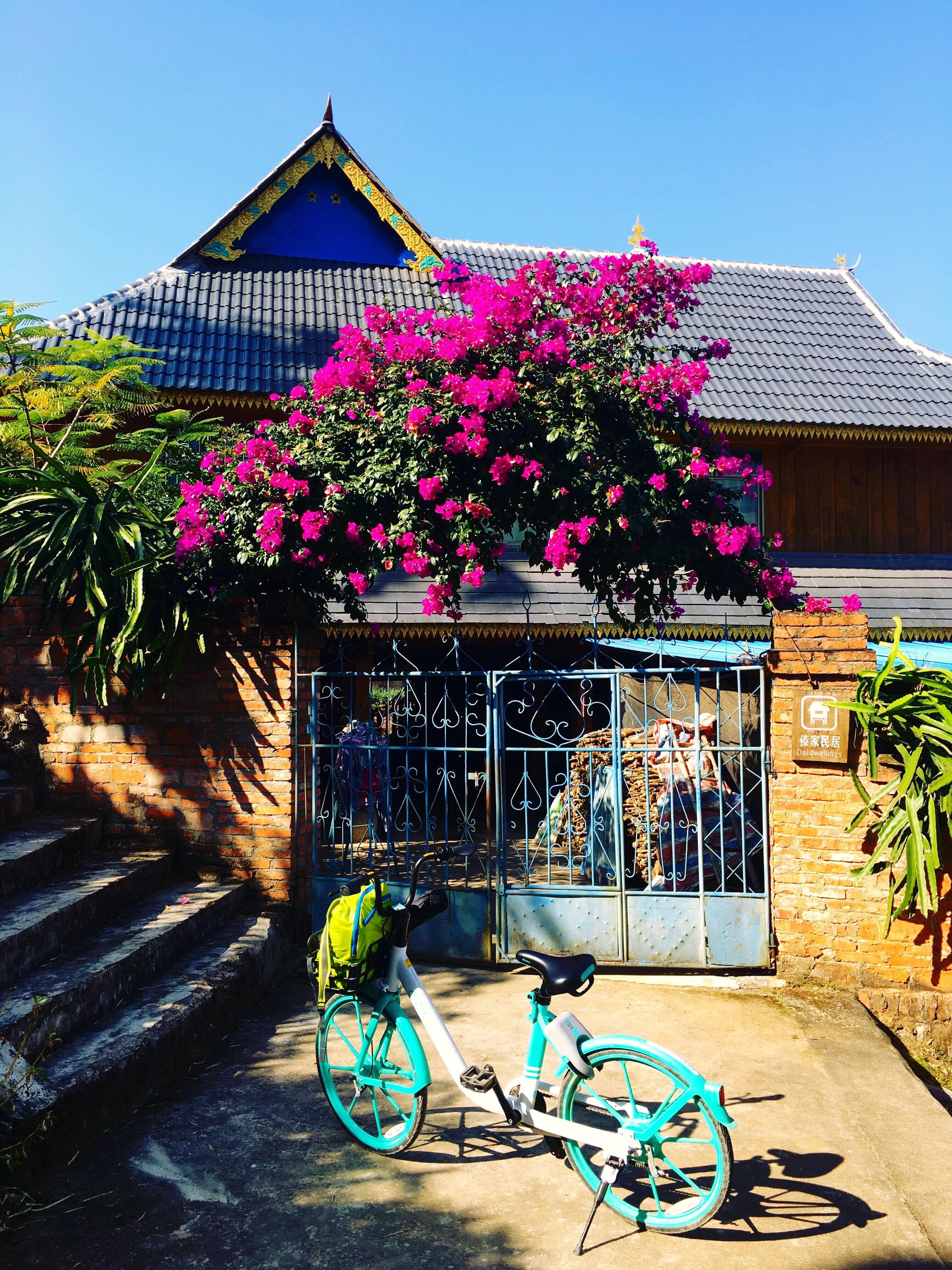 在寨子的半山坡,有一座佛寺,门口挂着经幡。我探头向里张望,除了傣家竹楼外,没有特别之处。如果不是挂着经幡,我还以为是傣民居住的地方呢。佛寺旁还有一棵神树,树下供奉着鲜花果品等。游览一圈下来,我认为曼丢古寨最大的特点是安静、干净。村里没有游客,少喧哗,少商业味,甚是朴素。这种原汁原味的古寨,是傣族最曼妙的风景了。