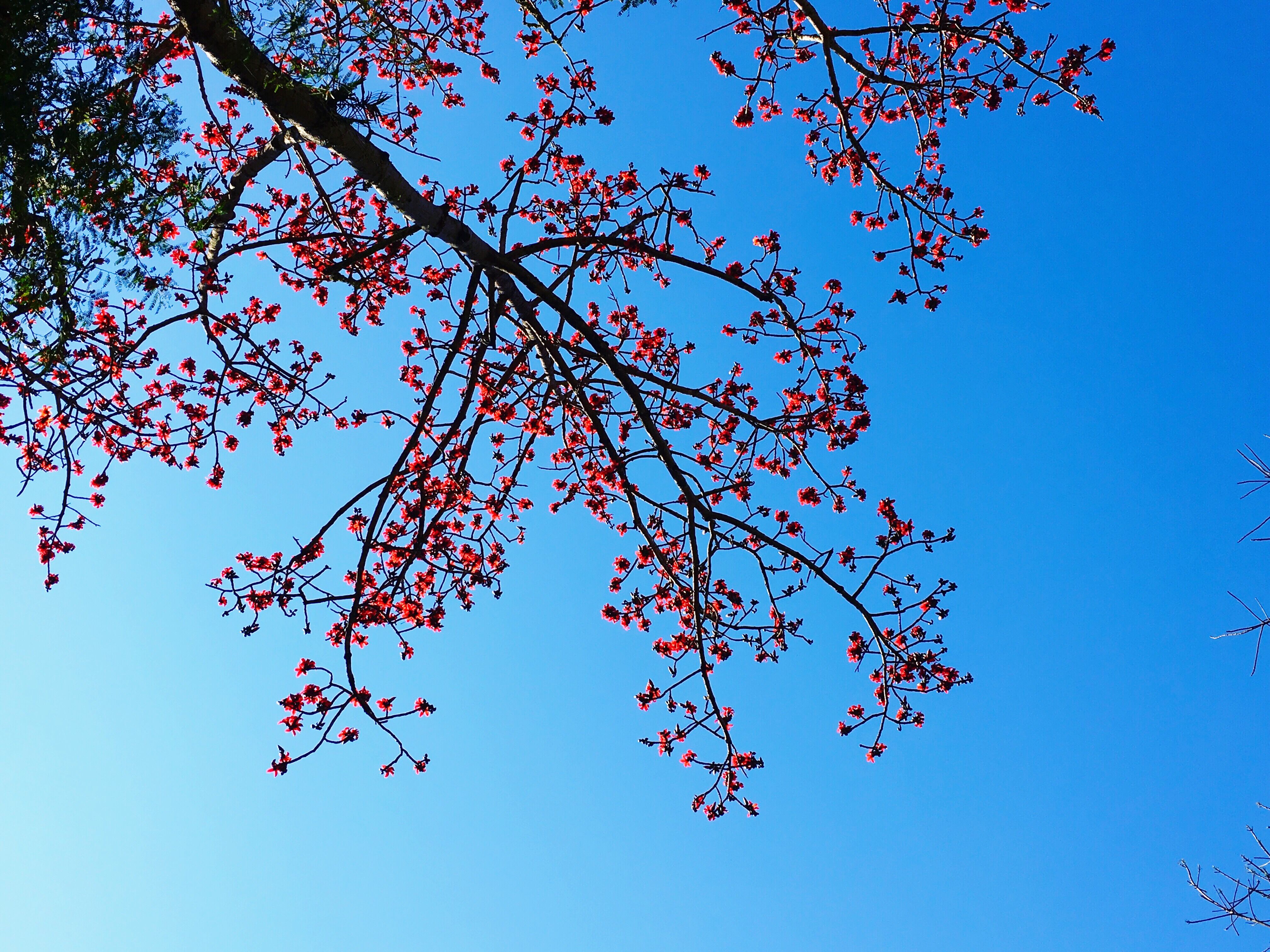 在佛寺旁边,有一棵开花的木棉树。这棵树高大挺拔,开着红彤彤的花朵,引人注目。仰望参天大树,枝头花朵已打蔫,风吹过,能听到啪啪的落花声。看着遍地落红,不禁让人感概花开花落,生命的轮回。