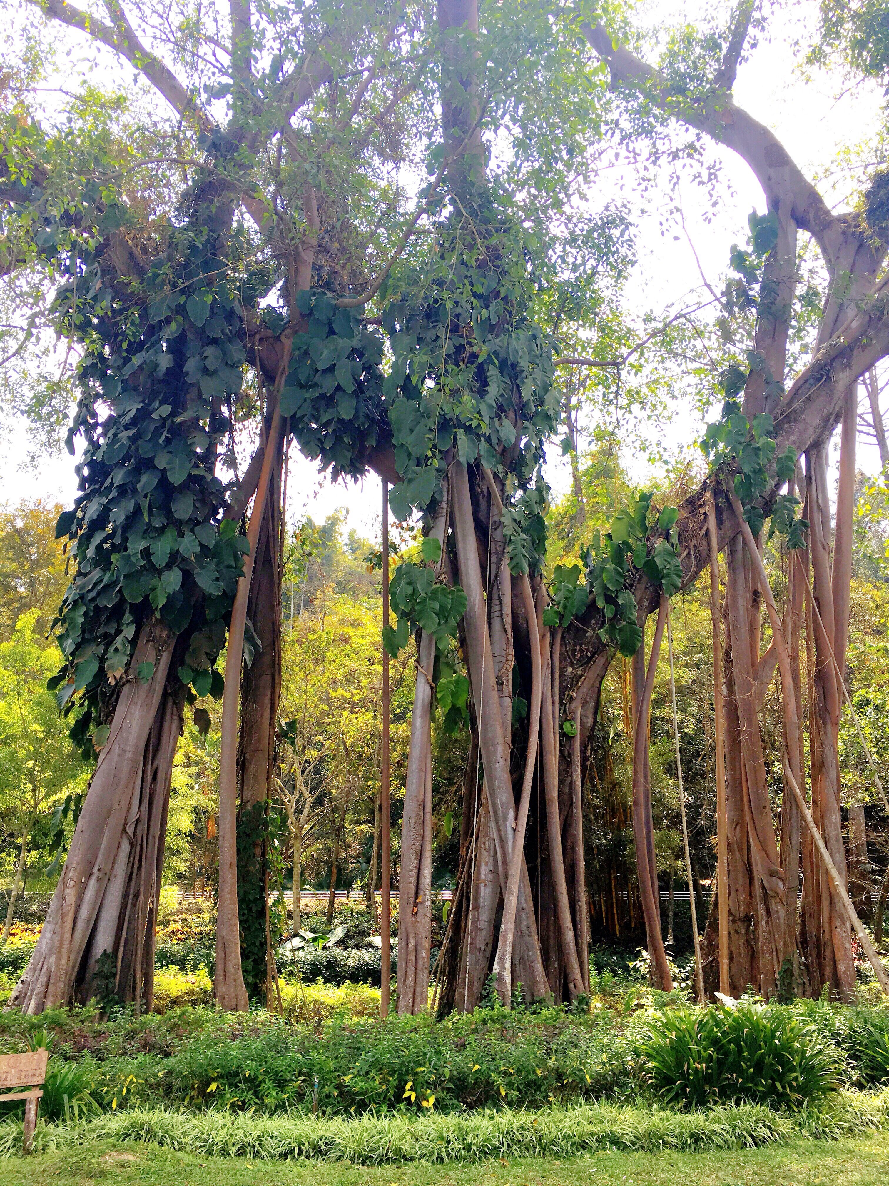 导游带大家来到独木成林公园,把几个不去参观的放在公园门口,就带着队伍进景区了。我在门外闲逛,这里也有购物店,而且人还不少。门口的建筑也很有特色,这拍拍,那看看,不知不觉随着人群走进了一片空地。空地中央有一棵大树,围满了游客。我挤进去观看,原来这就是独树成林景点。呵呵,得来全不费功夫,还省了门票钱呢。