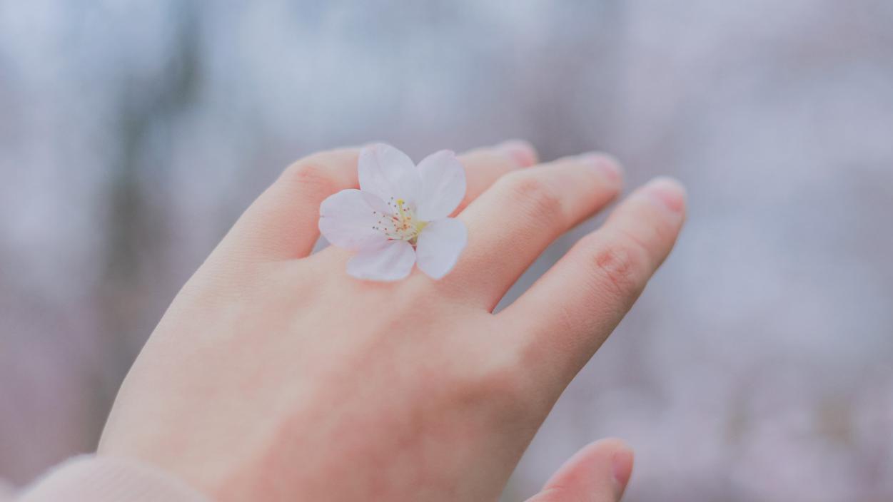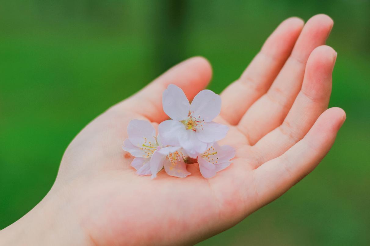 4.樱花和手互动。把樱花夹在手指间,能一秒变纤纤玉手;也可以把掉落的樱花放在手掌上,立马能拍出日系小清新。