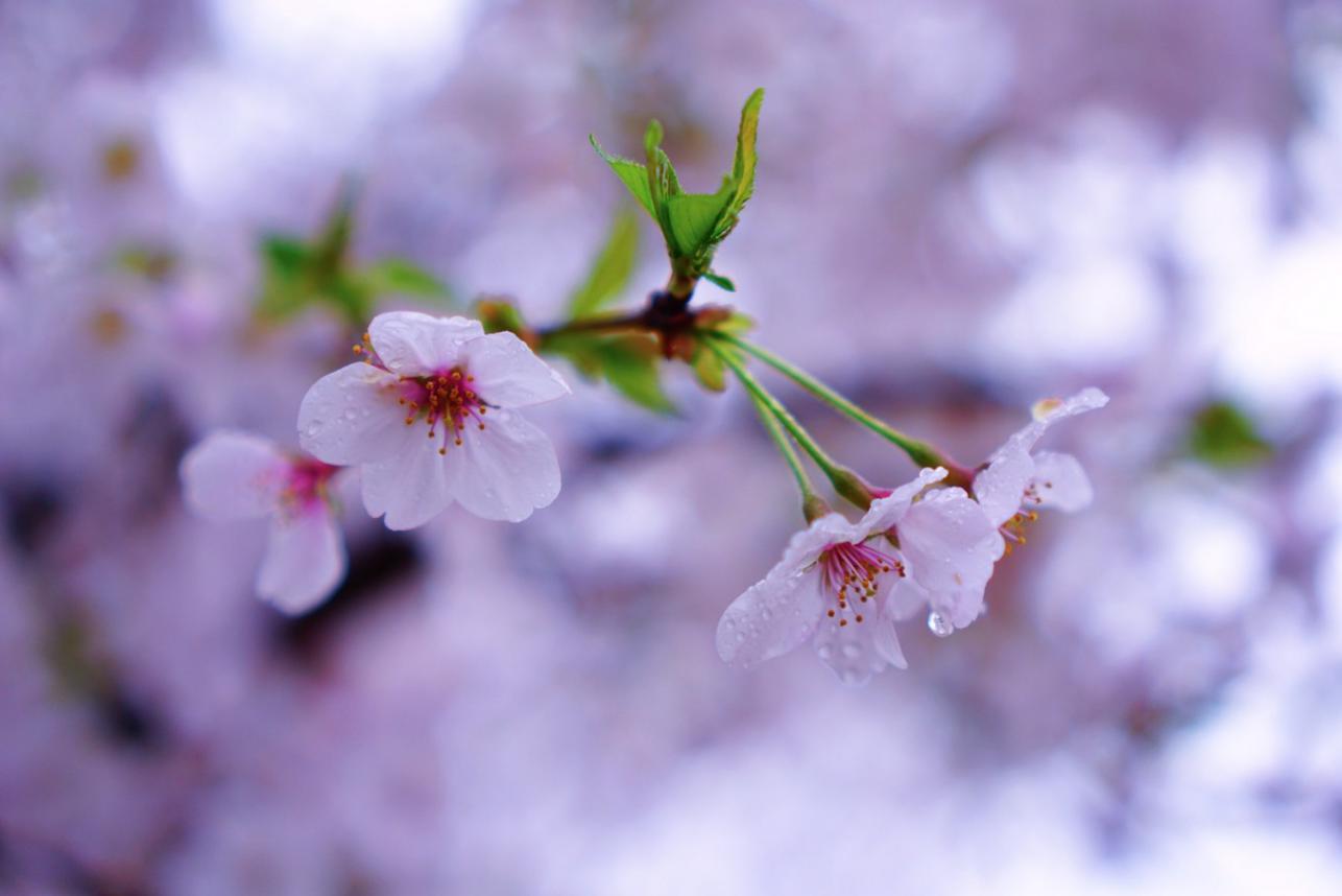 5.下雨天巧用雨水。如果刚下过雨,可拍摄出樱花上的雨滴。挂着盈盈雨滴的樱花瓣是另一番美景,能拍出和晴天截然不同的氛围。