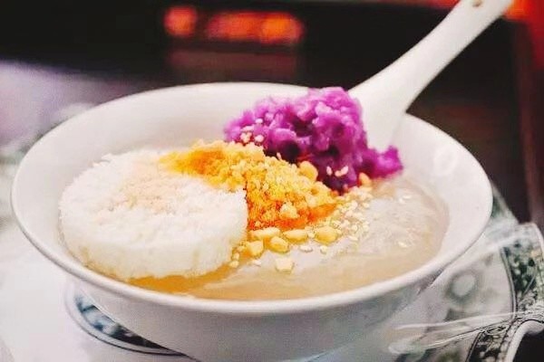 2.冲冲糕:将米粉装进模具蒸制成型,再用荸荠粉用水调成糊糊,加入蒸好的冲冲糕,最后拌上芝麻仁、花生仁、桃仁、葵花仁、瓜子仁、白糖、玫瑰糖等配料,清甜可口。