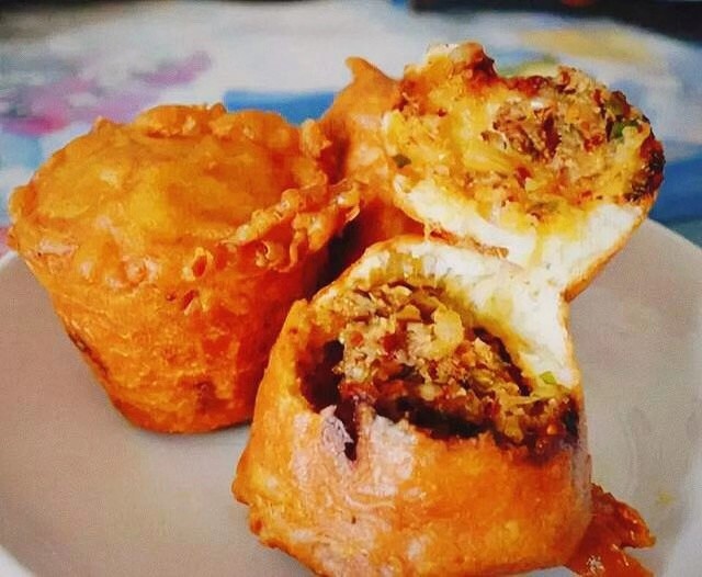 3.油炸鸡蛋糕:油炸鸡蛋糕,可不是传统意义上的蛋糕。蛋外皮是用大米和黄豆磨浆炸制而成,形状很像蛋糕,里面是肉馅。吃的时候要压破,淋上酱汁,加入凉拌折耳根,和豆浆绝配!