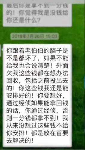其实,戴晴此前便隐约察觉到了不对劲。2016、2017年给齐蔷用于投资的200万元,一直没能像以前一样获得回报。每一次问起齐蔷,她都用各种方式搪塞过去——给戴晴展示公司“中东海外市场部”的群聊记录,承诺自己即使卖房也会还钱。