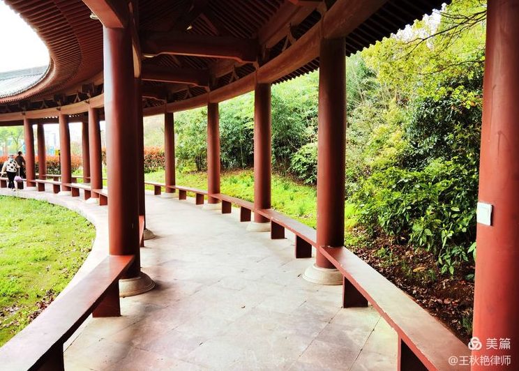今天我们看到的琵琶亭,是1988年3月新建。占地面积3300多平方米,坐北朝南。整个庭院采取中轴线对称布局,分主亭、左碑廊、右碑廊三部分,主建筑琵琶亭高20米,双层重檐,上悬刘海粟大师题写的 “琵琶亭”匾额,亭前大门照壁上有毛泽东墨迹《琵琶行》巨幅贴金大理石碑刻,上刻《琵琶行》长诗,全文共616字。亭院正中,矗立着汉白玉白居易塑像。亭院两旁建有碑廊,镶嵌着历代诗人题咏 琵琶亭诗赋共56块碑刻。