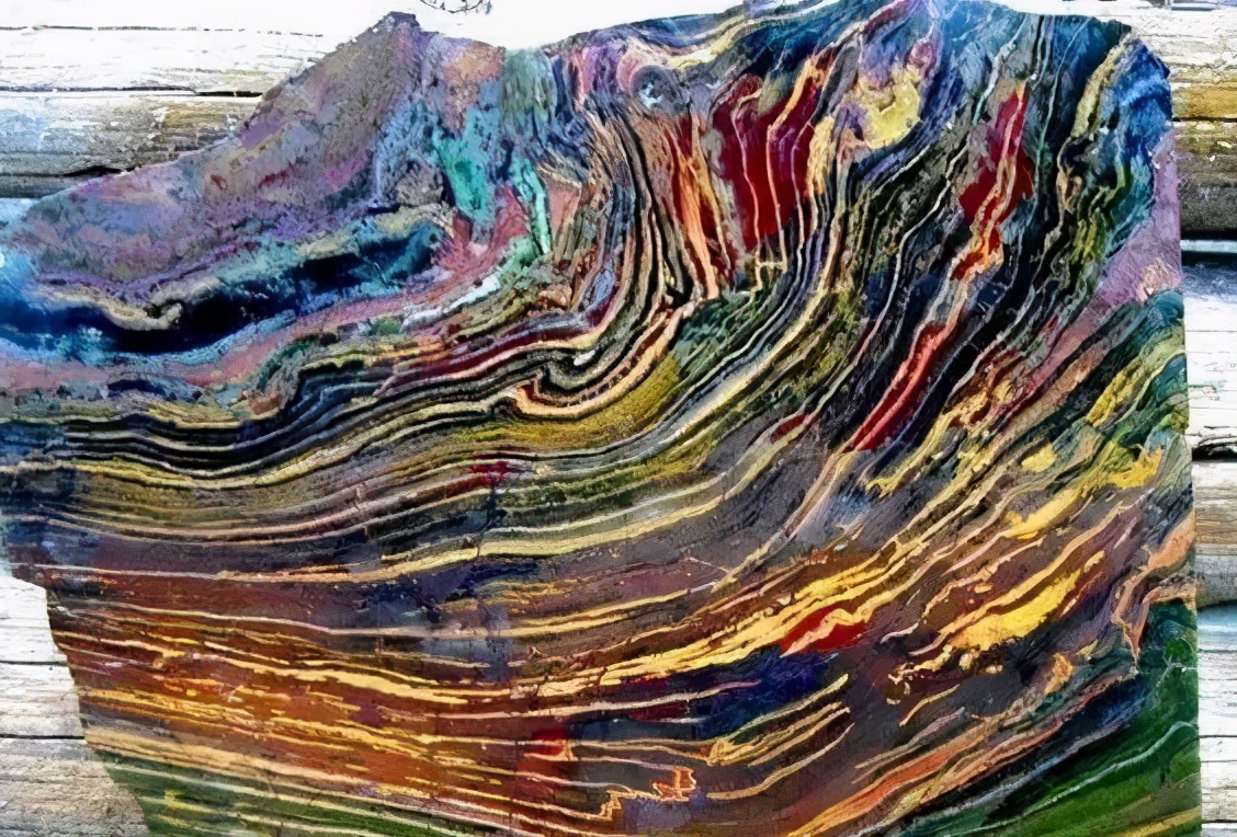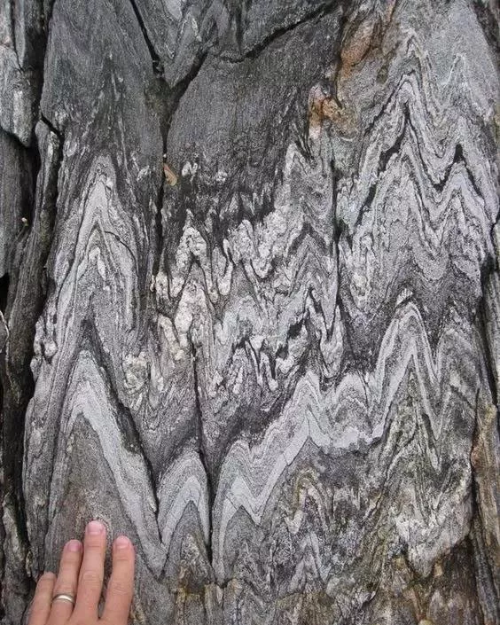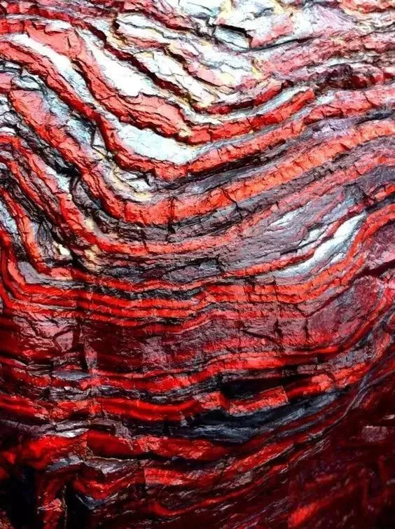 27、密歇根州立大学地质学提供:赤铁矿带沉积层,其中灰色和黑色是磁铁矿,红色是前寒武纪碧玉。带状铁建造。