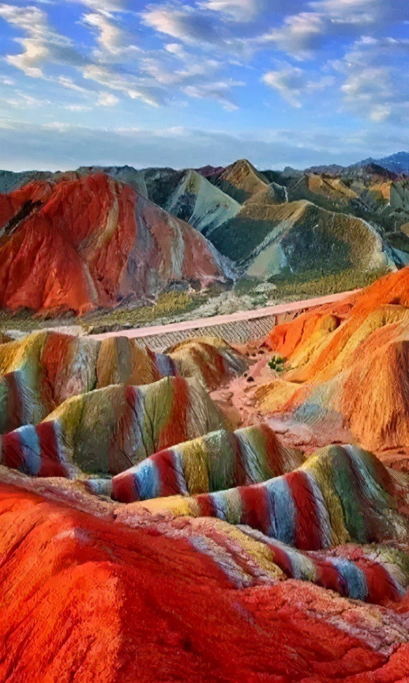 彩丘属于多种因素形成的丘陵状杂色岩石地貌,因为其缤纷的色彩而被称为彩色丘陵。实际上,张掖丹霞地貌地质公园是丹霞地貌和彩丘地貌的地质景观复合区。