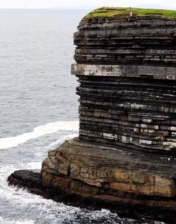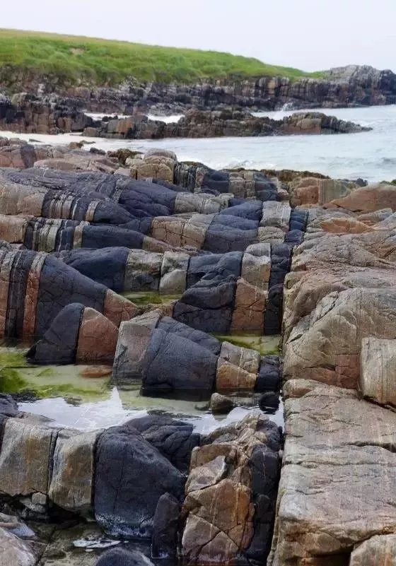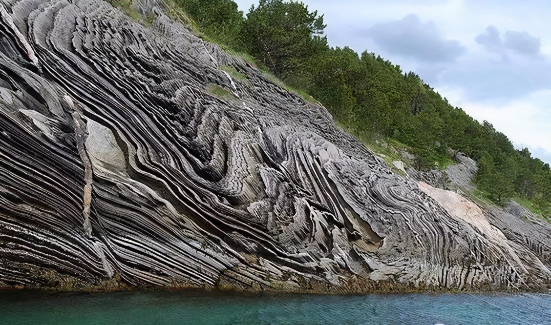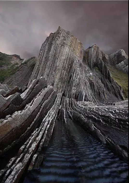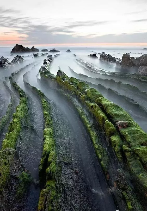 33、西班牙北部的扎马亚海滩复理石岩层。复理石是一种特殊的海相沉积岩套,由频繁互层的、侧向上稳定的海相矿岩和(或)较粗的其他沉积岩和页岩层组成。